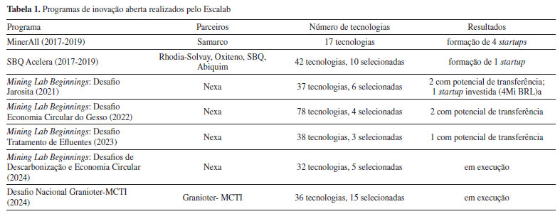 RESULTADOS E DISCUSSÃO O Escalab e os vários programas de inovação aberta já executados com a indústria O Escalab tem desenvolvido desde 2018 diferentes programas de inovação aberta com a finalidade de buscar tecnologias para solução de desafios de diferentes indústrias (Tabela 1).
