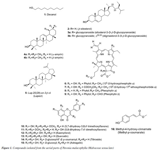 Janderson Barbosa Leite de AlbuquerqueI; Otemberg Souza ChavesI; Wallace Amorim Machado de QueirozI; I. Pós-Graduação em Produtos Naturais e Sintéticos Bioativos, Centro de Ciências da Saúde, Universidade Federal da Paraíba, 58051-900 João Pessoa - PB, Brasil Received: 01/30/2025 *e-mail: mfvanderlei@ltf.ufpb.br Pavonia malacophylla (Link & Otto) Garcke (Malvaceae sensu lato), commonly known as "malva-rosa" or "malva-veludo", is traditionally used to treat flu, cough, and heart pain. The crude ethanolic extract (CEE) of P. malacophylla was obtained through maceration with ethanol, concentrated using a rotary evaporator, and subjected to vacuum liquid chromatography with silica gel 60 as the stationary phase. Hexane, ethyl acetate, and methanol were used as mobile phases in increasing polarity gradients, yielding nine fractions. Chromatographic fractionation led to the isolation and identification of 18 compounds, including one alcohol, three steroids, three triterpenes, four pheophytins, six flavonoids and one phenolic acid. Among these, compounds 1 (decanol), 4a (α-amyrin), 4b (β-amyrin), 11 (5,8-dihydroxy-7,4'-dimethoxyflavone) and 16 (methyl-4-hydroxycinnamate), were identified for the first time in the genus Pavonia. Microbiological assays of the CEE, fractions, and isolated compounds were conducted against Escherichia coli,Candida albicans, and Staphylococcus aureus, demonstrating antimicrobial activity at concentrations ranging from 250 to 400 µg mL-1. INTRODUCTION The development and spread of microbial infections have generated worldwide concern.1 The indiscriminate use and increase in consumption of antimicrobial agents, together with inadequate prescriptions, has contributed to the process of resistance to these drugs, whether through spontaneous mutations or the attribution of new genes that will be inherited by offspring.2,3 Furthermore, the number of infections caused by multidrug-resistant microorganisms has amplified the spectrum of intractable diseases in the current context.4 From the moment penicillin was developed in the mid-1940s, the field of science turned to the search for antimicrobial derivatives from natural products.5 Medicinal plants perform an essential role as the main therapeutic source used in folk medicine. Previous ethnic-medical-botanical studies form the basis for the discovery of new antimicrobials from these herbs.6 Microbiological tests have demonstrated the high antimicrobial power of extracts, fractions, and isolated compounds, such as pheophytins, alkaloids, terpenoids and flavonoids, confirming the potential activity of these natural products.7-11 The Malvaceae sensu lato family comprises around 245 genera and 4465 species distributed throughout tropical and subtropical regions of the world.12 Among the various genera belonging to this family, the genus Pavonia Cav. concentrates approximately 271 species distributed throughout the New and Old World, including Brazil.13 Previous studies11,14 report the prevalence of several classes of secondary metabolites in this genus, such as fatty acids, phenolics, steroids, terpenoids, flavonoids, pheophytins and hydrocarbons. Pavonia malacophylla (Link & Otto) Garcke is popularly known as "malva-rosa" or "malva-veludo", distributed throughout Brazil. Its leaves and roots have been used to treat coughs and flu in the form of syrup, in addition to the use of its raw leaves to treat heart pain.15,16 A preliminary phytochemical screening detected the presence of triterpenes, steroids, flavonoids, coumarins, tannins and alkaloids in the crude ethanolic extract from its aerial parts.17 Considering these aspects and the antimicrobial potential of species of the genus Pavonia linked to the shortage of phytochemical data on the species P. malacophylla, the present study aims to isolate and identify substances from their aerial parts and evaluate their antimicrobial activity.