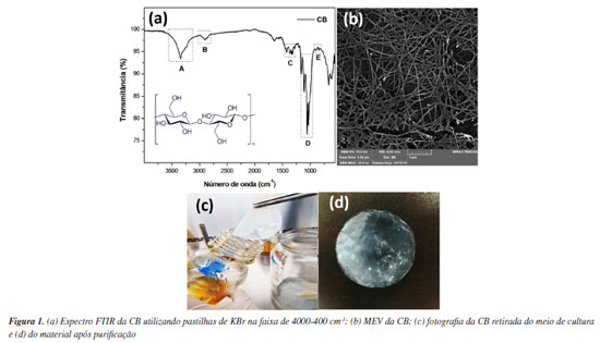 RESULTADOS E DISCUSSÃO Caracterização da CB O comportamento vibracional da CB foi investigado (Figura 1a). A banda A em 3344 cm-1 refere-se ao padrão de estiramento H-O, com um perfil bem conhecido de interação intermolecular entre os grupos hidroxila.57 O pico B em 2897 cm-1 é atribuído ao grupo metileno (-CH2-) presente na zona cíclica da estrutura da CB. O sinal C em 1361 cm-1 mostrou vibrações associadas a grupos metínicos (-CH-).58 Também foi observado que um pico D em 1161 cm-1 foi causado pelo estiramento assimétrico de -C-O-C- do tipo de ligação glicosídica (β1→4).59 Finalmente, em 1109 cm-1, o pico E atribuído à ligação -C-O presente na unidade mínima do polissacárido.60 Na Figura 1b as micrografias demonstram a morfologia caraterística da CB apresentada em microfibras.59 Tanto o tamanho quanto a largura foram medidos no programa ImageJ®, levando a uma ordem de tamanho de 15-42 nm para as fibras de CB. Vale ressaltar que a K. xylinus sintetiza fibras primárias com dimensões laterais na faixa de 7 a 13 nm, que podem se agregar em faixas finas e planas com sua largura chegando a 70 nm.61 O aspecto macroscópico da CB produzida é apresentado na Figura 1c, onde membranas circulares uniformes podem ser comprovadas na Figura 1d.