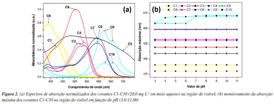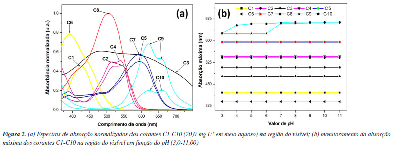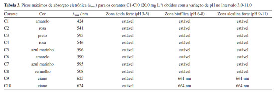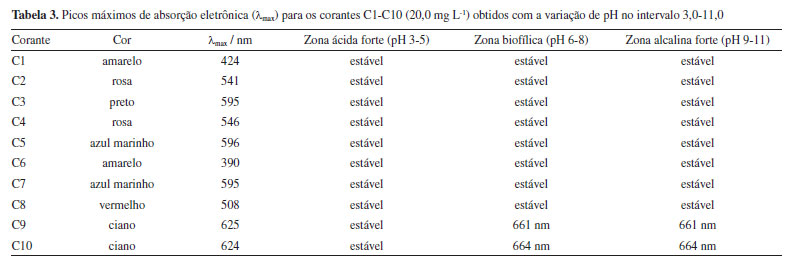 Os dados apresentados na Tabela 2 indicam a presença de alguns metais e metaloides potencialmente tóxicos,62 tais como As, Cu, Mo e Zn (C1, C9 e C10), que não deveriam estar na composição do corante têxtil orgânico de acordo com as informações do rótulo. Este tipo de contaminação pode ocorrer devido a alguns mecanismos, como um processo de purificação ineficiente da produção de corantes15 ou a reutilização negligente de recipientes para mistura de corantes primários afim de se obter diferentes tonalidades de pigmentos.63,64 O segundo mecanismo ocorre normalmente porque a prática de misturar corantes é a mais utilizada recorrentemente para obter tonalidades únicas brilhantes.65,66 O elevado teor de Cu nos corantes C9 e C10 é destacado mediante sua toxicidade em potencial, uma vez que o consumo recorrente de alimentos e água contaminados pode provocar efeitos secundários preocupantes.67 Já é relatado efeitos adversos como vômitos, arritmia, hipotensão, danos renais, hepatite aguda e sangramento gastrointestinal.68 A elevada concentração de Cu2+ também tem relação com a alopecia e diabetes69,70 e pode agravar diagnósticos clínicos críticos como a doença de Wilson.71,72 Para além do cobre, foram também detectados teores significativos de Mo nesta técnica, o que poderá ser explicado pela elevada afinidade entre estes dois elementos em minerais, por exemplo.73 A associação entre o cobre e o molibdênio ocorreu majoritariamente devido à sua afinidade e semelhança química nos minérios, o que os torna um subproduto de outro no processo de purificação industrial.74 Outra questão são os altos níveis de Na em todas as dez amostras, o que pode afetar a salinidade do corpo hídrico e desequilibrar os parâmetros naturais da água doce, causando danos à fauna nativa.75 A eliminação incorreta de efluentes ricos nestes tipos de contaminantes pode causar danos graves ao ambiente através da descarga de poluentes orgânicos e inorgânicos tóxicos na água.76,77 Espectroscopia de absorção eletrônica e análise de estabilidade com variação de pH As soluções-estoque (20,0 mg L-1) de C1-C10 foram submetidas à análise de absorção eletrônica em diferentes valores de pH e seus comprimentos de onda máximos foram definidos na Figura 2. Na etapa seguinte, foi estudada a estabilidade dos corantes têxteis em função do pH do sistema (Tabela 3).