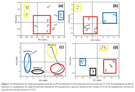 Este ensaio ajudou a compreender o comportamento químico da estrutura do corante e a estimar a possibilidade de rearranjo intramolecular promovido pela acidez da solução.78 Como podemos observar na Figura 2a, cada corante apresentou uma banda na região de sua repectiva coloração complementar, exceto o corante C3, que apresentou uma banda larga cobrindo todo o espectro visível. Os espectros de absorbância dos corantes orgânicos (C1-C8) apresentam transições causadas pelos principais grupos cromóforos nas estruturas químicas, tais como antraquinona,79 porfirina,80 azo81 e sistemas π hiperconjugados.82,83 Os corantes metalorgânicos C9 e C10 mostraram dois picos principais com a contribuição do Cu2+ preso no anel tipo porfirina por ligações coordenativas.84 Na Figura 2b é perceptível alterações na estrutura do pigmento metalorgânico quando a forma ácida é submetida a um meio fortemente alcalino. Este comportamento pode indicar que o íon cobre pode ser liberado na zona ácida (devido à protonação excessiva dos sítios básicos de nitrogênio) e mais facilmente lixiviado para o solo ou para a água quando erroneamente descartado.85 Esta evidência é uma informação crucial para a seleção da natureza do corante para os ensaios de adsorção, tendo em conta o perfil de contaminação bidirecional deste poluente antropogênico. Análise multivariada Com base nos dados extraídos das regiões de absorbância, estabilidade em pH variante e teor de metais quantificados na análise ICP-OES para os dez corantes, foi possível dividir as amostras em clusters menores devido à sua semelhança química e estatística. Foi organizado o agrupamento estatístico via análise de componetes principais (do inglês, principal component analysis - PCA) de acordo com as informações inicialmente disponíveis, como demonstrado na Figura 3.