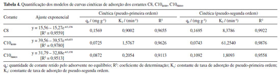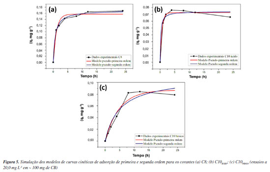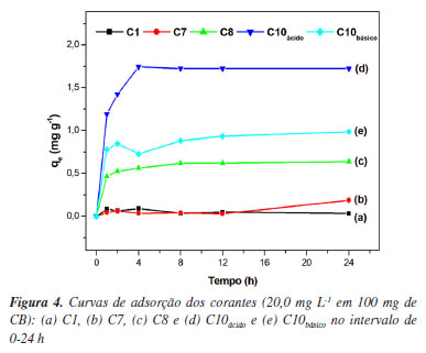 A primeira conclusão desta abordagem matemática pode ser observada nas Figuras 3a e 3b, extraídas no ICPOES, que a composição química foi a principal responsável pelos critérios de classificação. Nos extremos, temos dois grupos associados à presença de Zn ou Cu/Mo de alguma forma. Os elementos restantes variaram igualmente para C1-C10. Os clusters demarcados na Figura 3b estão divididos pela sua toxicidade, em que C1 é a representação de um elevado nível de Zn para corantes amarelos,86 enquanto C9-C10 foram responsáveis por elevados níveis de Cu/Mo nos corantes azuis. A PCA da Figura 3c baseou-se na faixa de absorbância de cada corante têxtil, o que redimensionou o quantitativo de amostras a quatro grupos. A separação das amostras foi mais notável nessa segunda abordagem, comparada com a baseada no ICP-OES, gerando quatro grupos que foram melhor definidos entre si. Como podemos observar na Figura 3, os representantes dos pigmentos amarelos (C1) e azuis (C10) já haviam sido definidos, e agora foram instituídos representantes para os grupos pretos (C7) e o vermelhos (C8). A representatividade estatística desses corantes (C1, C7, C8 e C10) também é observada na natureza estrutural dos corantes. O efeito oposto na PC1 da Figura 3d distingue os sítios de cromóforos grandes, como a antraquinona e as ftalocianinas, dos aglomerados de corantes monoazo/diazo. Notou-se também que a classe dos corantes diretos (C3, C4 e C8) foi agrupada em um único grupo, para além dos pigmentos reativos. Após a PCA, o quantitativo de dez corantes foi reduzido a quatro grupos com cada representante (C1, C7, C8 e C10), devido à semelhança química e à minimização do número de ensaios, como uma vantagem das abordagens quimiométricas.87,88 Todos os quatro corantes escolhidos foram submetidos ao processo de tratamento por adsorção em CB para investigar o potencial de remoção deste biomaterial adsorvente como uma alternativa barata e viável para o tratamento de águas residuais em grande escala.85 Cinética de adsorção Com base no agrupamento estatístico, C1, C7, C8 e C10ácido e C10básico foram submetidos a testes de adsorção, conforme descrito na seção "Parte Experimental". Foi verificado no estudo de estabilidade, dentre os corantes representativos, que apenas o C10 apresenta sensibilidade química à variação do pH do meio, por esse motivo, sua cinética foi realizada tanto em zona alcalina forte (pH 11,0) como em zona ácida forte (pH 3,0) para posterior comparação em termos de otimização do processo de remoção. Os desempenhos de remoção de CB para C1, C7, C8 e C10ácido e C10básico são apresentados na Figura 4.