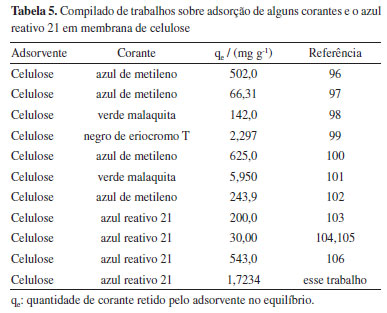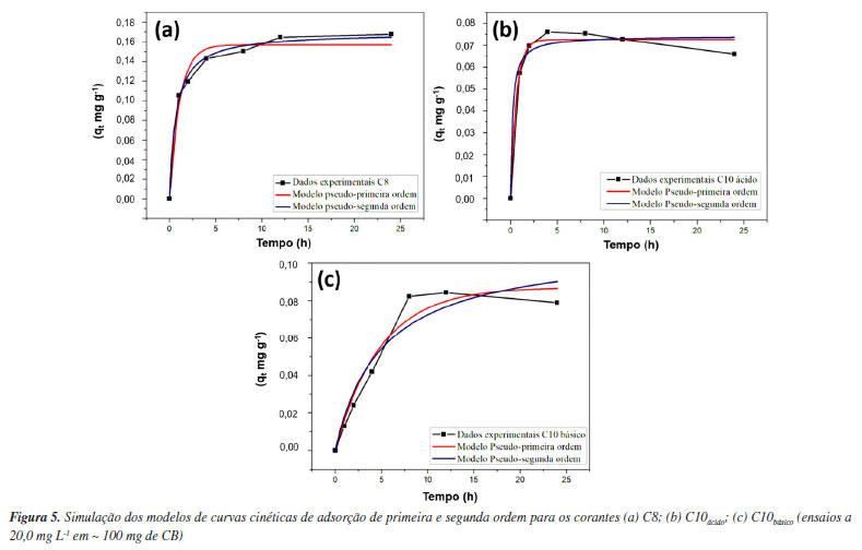 Os parâmetros cinéticos obtidos no processo de adsorção do corante representam regressões lineares nos gráficos de cada modelo, como indicado na Tabela 4. Desta maneira, a avaliação quantitativa dos modelos foi realizada por meio da comparação entre os coeficientes de correlação. Verifica-se na Tabela 4 uma boa concordância entre os resultados teóricos e os dados experimentais quando se aplica o modelo de pseudo-segunda ordem para as curvas com C8, C10ácido e C10básico. O melhor ajuste ao mecanismo de pseudo-segunda ordem vem a ser obtido quando a proximidade dos valores trazidos pelo coeficiente de determinação (R2) é de aproximadamente 1,0. Desta maneira, fica demonstrado que o mecanismo de difusão intrapartícula não deve ser considerada como etapa determinante da velocidade. Quando considerado dentro do processo de transferência de massa, outros mecanismos devem ser inseridos para determinar o processo de adsorção.92 Neste sentido, manipulando-se as isotermas de adsorção do sistema, são utilizadas as equações de Langumuir e Fraundlich.93 Logo, os valores obtidos experimentalmente e as curvas que foram alcançadas foram vistas por meio dos valores estimados nas equações. As isotermas de equilíbrio apresentaram curva sigmoidal, onde é esperado uma monocamada de analito sobre a superfície do adsorvente, aumentando a afinidade da adsorção à medida em que se aumenta a concentração do adsorbato até a saturação.94 Ao analisar a Figuras 5b e 5c, pode ser observado que para C10, independentemente do meio, o perfil da isoterma aproxima-se do modelo de pseudo-segunda ordem, pois seu R2 modela o gráfico de forma a se assemelhar a equação logarítmica desse modelo. Verificou-se também que a adsorção segue o modelo de pseudo-segunda ordem devido a heterogeneidade da CB, confirmando que o controle do mecanismo de velocidade é a adsorção química (reação química).95 Para melhor ilustar o desempenho da CB na remoção de corantes têxteis, diversos trabalhos foram agrupados na Tabela 5. Ao comparar os melhores valores de adsorção entre as três isotermas de C8 e C10, o volume adsorvido pelo método do C10ácido é o que foi escolhido para comparação com a literatura, devido a sua performance superior aos demais tratamentos. Os resultados de qe (1,7234 mg g-1) são inferiores aos presentes na Tabela 5, mas não inviabiliza sua aplicação na adsorção de corantes. Os ensaios preliminares não consideram a otimização dos parâmetros reacionais (concentração do analito/tempo reacional/temperatura), nem propriedades morfológicas do material como área superficial, tamanho de poros, definição do ponto de carga zero ou qualquer tipo de modificação química na estrutura da celulose. Desta forma, os resultados obtidos ainda podem ser melhorados considerando experimentos em maiores escalas, estudo de ciclos de adsorção e dessorção.95