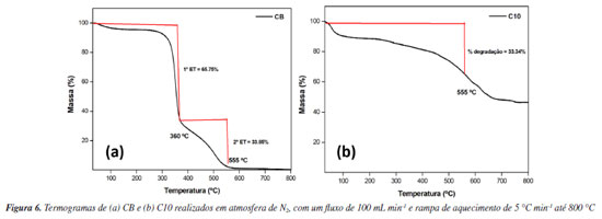 Avaliação térmica da CB e dos corantes têxteis A CB isolada e o C10 foram submetidos à avaliações térmicas afim de compreender a estabilidade de degradação de cada espécie e desta forma propor um processo de recuperação parcial de corantes presentes em águas residuais têxteis. A razão para a seleção do C10 como modelo inicial baseou-se na sua melhor taxa de adsorção e maior valor de qe na abordagem de tratamento com a CB. Os termogramas da CB e C10 são ilustrados na Figura 5. A Figura 6a ilustra o comportamento térmico da CB, onde são destacados dois eventos térmicos (ET) principais, relacionados com a degradação quase completa do polissacarídio a temperatura > 500 ºC.107