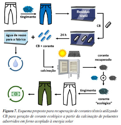 Assim, destaca-se a possibilidade de após a etapa de remoção de corantes pelas características do adsorvente CB, tendo em conta o enorme volume diário de águas residuais e lodo produzidas pela indústria têxtil, será possível recuperar uma quantidade expressiva de corante a partir do uso de energia limpa e renovável, com forno solares, podendo tornar o processo de tingimento mais barato e reduzindo a liberação de metais potencialmente tóxicos no meio ambiente.