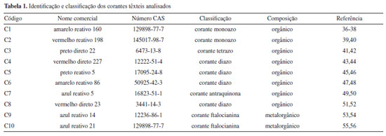 PARTE EXPERIMENTAL Reagentes Os reagentes e solventes utilizados apresentam grau analítico e foram utilizados sem prévia etapa de purificação. Os produtos químicos de partida foram ácido clorídrico 36,5% (Dinâmica), ácido nítrico 65% (Neon), ácido succínico 99% (Sigma-Aldrich), D-manitol 99% (Nuclear), extrato de levedura (Himidea), glicerol 99,5% (Dinâmica), hidróxido de sódio 99,8% (Neon), monohidrogenofosfato de sódio dodeca-hidratado 98,0% (Dinâmica) e peptona (Kasvi). Coleta de amostras e soluções de trabalho Todos os corantes têxteis foram adquiridos em um mercado local de lavandaria na cidade de Toritama, Pernambuco, Brasil, tendo como coordenadas geográficas 08º 00' 24" de latitude sul, 36º 03' 24" de longitude oeste, e altitude 349 m. A amostragem de cada corante foi realizada em triplicada, sendo codificadas de acordo com a Tabela 1. Para o preparo das soluções, as amostras de corantes têxteis foram submetidas a uma temperatura de 110 ºC por 12 h para secagem completa e resfriadas em um dessecador. A solução-estoque de cada corante foi preparada com uma concentração de 20,0 mg L-1, utilizando água destilada previamente fervida para retirar os gases do meio e evitar qualquer processo de oxidação indesejada e variação no pH do sistema. Para melhor conservação, todas as soluções de reserva foram armazenadas em frascos âmbar a ~ 5 ºC.