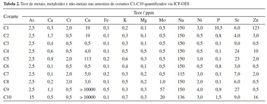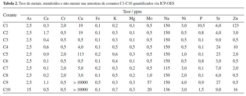 Composição química dos corantes têxteis Para a caraterização inicial dos dez corantes têxteis escolhidos para esta pesquisa, foi realizada a análise por ICP-OES para quantificar o teor de metais em cada amostra e verificar a autenticidade do tipo de corante adquirido no mercado de lavandaria, área apontada neste estudo. Na Tabela 2 estão resumidas as concentrações mais expressivas de metais nas espécies investigadas.
