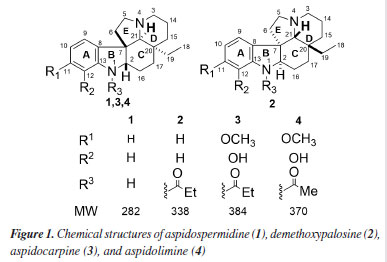 Yan R. RoblesI; Ricardo VessecchiI; Ivo J. C. VieiraII I. Departamento de Química, Faculdade de Filosofia, Ciências e Letras de Ribeirão Preto, Universidade de São Paulo, 14040-901 Ribeirão Preto - SP, Brasil Received: 02/07/2025 *e-mail: millercrotti@ffclrp.usp.br The fragmentation of four deprotonated plumeran indole alkaloids (PIAs), namely aspidospermidine (1), demethoxypalosine (2), aspidocarpine (3), and aspidolimine (4), previously isolated from Aspidosperma spruceanum has been investigated by electrospray ionization tandem mass spectrometry (ESI-MS/MS) in the negative ion mode. The fragmentation pathways have been established on the basis of accurate mass data. Our results demonstrated that the main product ions of deprotonated 1-4 result from remote hydrogen rearrangements. The most abundant product ion in the product ion spectrum of 2, 3, and 4 was the result of a ketene loss (methylketene for 2 and 3, and a ketene for 4) directly from the precursor ion. The product ion of m/z 183 was diagnostic for compound 2, whereas the radical loss of CH3 occurred only for 3 and 4, which display an aromatic methoxyl group in their structures. These results indicated that ESI(-)-MS/MS could be also used for the identification of PIAs 1-4 in crude extracts using LC-ESI-MS/MS, especially when the extracts are more complex. INTRODUCTION The genus Aspidosperma, belonging to the family Apocynaceae, is native to the Americas, and predominantly located between Mexico and Argentina.1 The species of this genus are commonly used in folk medicine, where they are regarded for their potential antimalarial and contraceptive properties.1 They are also used in the treatment of conditions such as leishmaniasis, inflammation of the uterus and ovaries, diabetes, gastrointestinal disorders, cancer, fever, and rheumatism.1 From a chemical standpoint, these species are important sources of alkaloids, particularly indole-type alkaloids.1,2 Plumeran indole alkaloids (PIAs), including aspidospermidine (1), demethoxypalosine (2), aspidocarpine (3), and aspidolimine (4) (Figure 1), are frequently extracted from various species of the Aspidosperma genus. Aspidospermidine represents the most basic structure among a series of PIAs characterized by a pentacyclic [6.5.6.5]ABCDE ring framework. The antiplasmodial,3 antihypertensive,4 antileishmanial,5 and antiplasmodial3 activities of these compounds have been reported.
