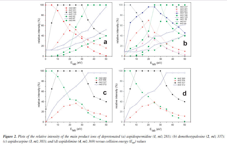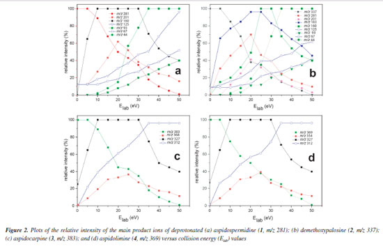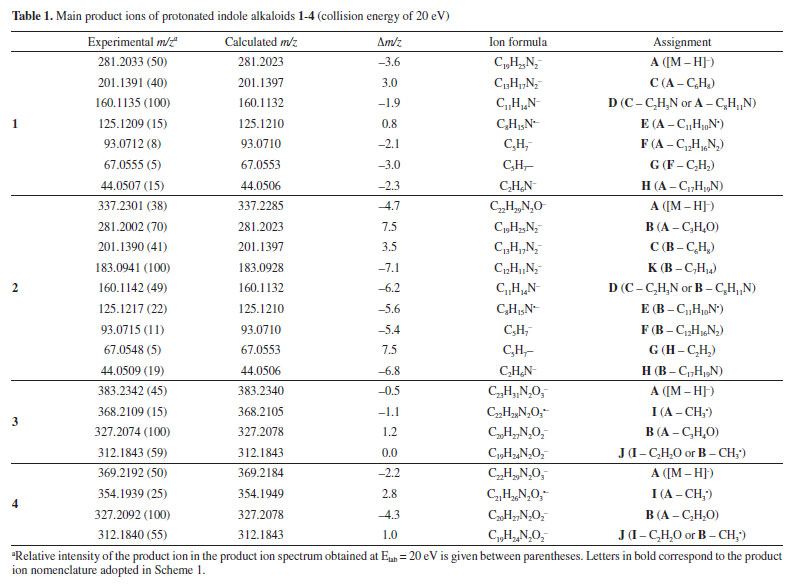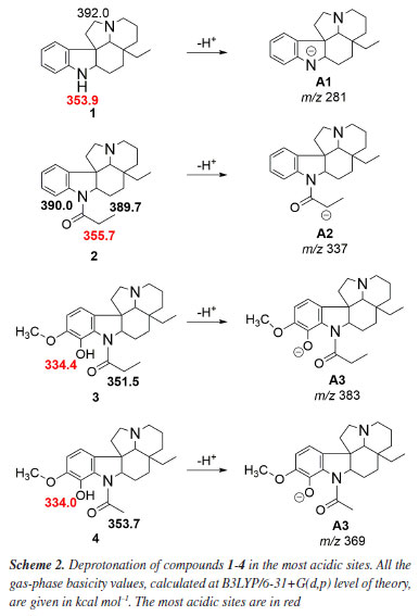 EXPERIMENTAL Chemicals Aspidospermidine (1), demethoxypalosine (2), aspidocarpine (3), and aspidolimine (4) were previously isolated from the methanol stem bark extract of A. spruceanum.16 Acetonitrile (HPLC grade), purchased from Aldrich (Steinheim, Germany), and Milli-Q (Millipore, Bedford, MA) deionized distilled water were used throughout the experiments. Samples were prepared at a concentration of 0.1 mg mL-1 from the respective stock solutions (1.0 mg mL-1) by dilution in acetonitrile/water (4:1 v/v). Mass spectrometry Mass spectral analyses were performed on an UltroTOF-Q Bruker Daltonics (Billerica, MA) mass spectrometer fitted with an electrospray ion source operating in the negative ion mode, and equipped with a hybrid quadrupole-time-of-flight mass analyzer. Samples were infused into the ESI source at a flow rate of 5 µL min-1. The source block and desolvation temperature was 150 ºC. An optimum energy of 3.5 kV was applied at the capillary emitter. This energy was found to maximize the number of ions with the m/z corresponding to the deprotonated molecule ([M - H]-) of each compound. The deprotonated molecule (precursor ion) was selected and fragmented by collision-induced dissociation (CID) using N2 as collision gas. The accurate masses were obtained by use of TFA-Na+ (sodiated trifluoroacetic acid) as the internal calibrant, which was observed at m/z 112.98556 (CF3CO2-) and m/z 248.96039 ([(CF3COONa)CF3COO]-).17 The Δm/z observed in all the experiments ranged from 0.5 to 8 ppm depending on the mass of the theoretical masses of the ions. Computational Chemistry All the structures had the geometries optimized in B3LYP/6-31+G(d,p) level,18,19 using Gaussian 09 suite program.20 Minimum at potential energy surface were characterized by calculations of harmonic vibrational frequencies. All the possible deprotonated species were considered using ∆Gacid (gas-phase acidity) in order to suggest the most stable deprotonation site in the gas-phase.21,22 ∆Gacid was computed through the following deprotonation reaction: MHg → Mg- + Hg+ by considering the Gibbs energies calculated at 298.15 K using B3LYP/6-31+G(d,p). Gibbs energy for the proton was considered as described by Range et al.23
