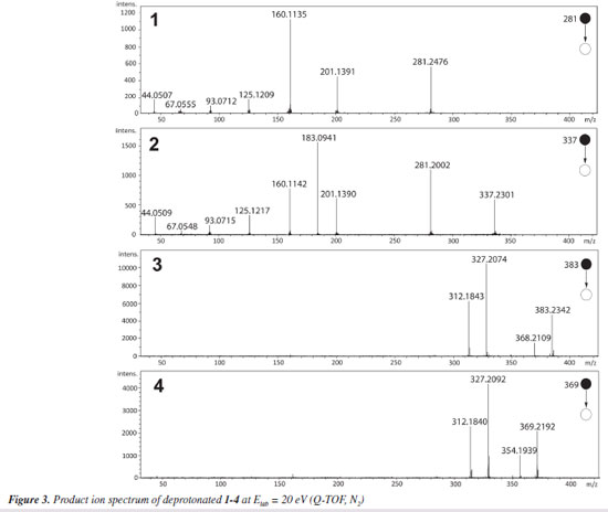 RESULTS AND DISCUSSION Structure-fragmentation relationships in PIAs 1-4 It is well-known in the literature that the energy transferred to the precursor ion upon collision-induced dissociation (CID) plays a key role in the product ion spectrum profile.24-26 In general, low collision energies produce few product ions, which are formed from the lowest activation barrier pathways. On the other hand, high collision energies can result in extensive fragmentation of the precursor ion by making possible the fragmentation through higher activation barrier pathways.27,28 Thus, to minimize the effect of the collision energy on the product ion spectra and better understand the role played by the structural features on the gas-phase fragmentation pathways of deprotonated compounds 1-4, the product ion spectra of 1-4 were obtained in collision energies (Elab) from 0 to 50 eV. Based on the plots of the relative intensity of the main product ions versus Elab (Figure 2), we selected Elab = 20 eV as the "optimal energy" (i.e., the maximum number of product ions with relative intensity higher than 5% without extensive fragmentation of the precursor ion).