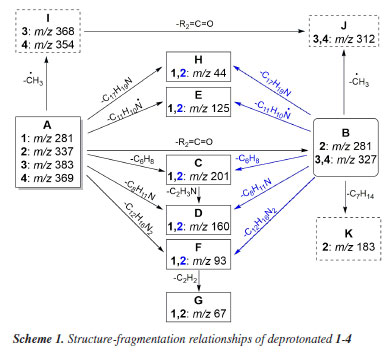 Although aspidocarpine (3, m/z 383), and aspidolimine (4, m/z 369) display an additional hydroxyl and methoxyl group in their structures compared to aspidospermidine (1), the number of product ions is considerably lower, even at higher Elab values. Besides the neutral loss of the acyl group from the precursor ion, a methyl radical loss (loss of 15 mass units) can also occur for compounds 3 and 4. This process is diagnostic for aromatic methoxyl groups in the structure of aspidocarpine and aspidolimine. An overview of the fragmentation pathways of compounds 1-4 is given in Scheme 1.
