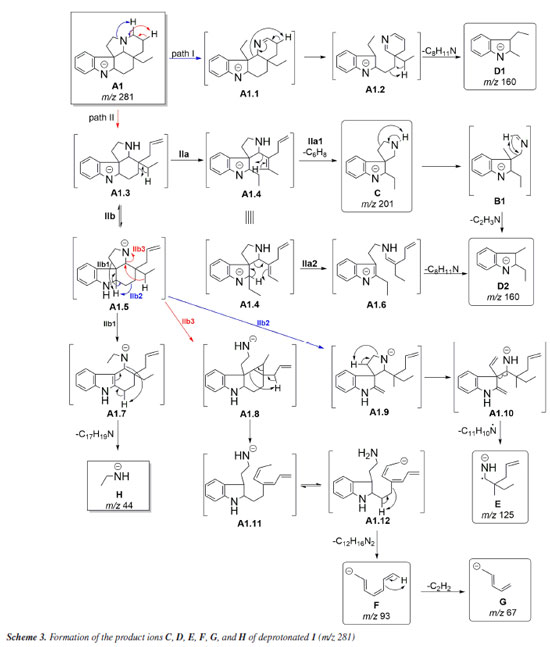 Fragmentation of deprotonated aspidospermidine (1) and demethoxypalosine (2) The formation of the main product ions of deprotonated 1 (m/z 281) is shown in Scheme 3. Most of the product ions result from remote hydrogen rearrangements and occur with the retention of the negative charge at the nitrogen atom. Pathway I involves the opening of ring E and produces the intermediate ion A1.1, whereas pathway II is initiated by the opening of ring D and the consequent formation of the intermediate ion A1.3. A remote hydrogen rearrangement results in the ring C opening and converts A1.1 into the intermediate A1.2. The elimination of C8H11N from A1.2 produces D (m/z 160), which is the base peak in the product ion spectrum of aspidospermidine (1). The product ion D can also be formed from A1.3 (pathway IIa), as shown in Scheme 3. In this case, the formation of D involves the ring C opening and the consequent conversion of A1.3 into A1.4. The neutral loss of C6H8 from A1.4 (pathway IIa1) produces C (m/z 201), which produces D after C2H3N neutral loss. On the other hand, the product ion D can also be formed through pathway IIa2 after C8H11N neutral loss (Scheme 3). The formation of the isobaric ions D1 and D2 by three different pathways could explain why product ion D is the base peak in the product ion spectrum of 1. The formation of the product ions E (m/z 125), F (m/z 93), G (m/z 67), and H (m/z 44) involves the intermediate ion A1.5, the less stable form of the equilibrium with A1.3, which is stabilized by the negative charge delocalization. Three competitive hydrogen rearrangements from A1.5 can result in the opening of ring C (pathway IIb2), and E (pathway IIb1), or in the formation of a three-membered ring (pathway IIb3) to produce the intermediate ions A1.9, A1.7 and A1.8, respectively (Scheme 3). The intermediate ion A1.9 can be converted into A1.10 after ring E opens through a remote hydrogen rearrangement, as shown in Scheme 3. The formation of E (m/z 125) occurs with the radical loss of C11H10N•. Although the formation of E from A1.10 violates the "Even-Eletron Rule",40,41 its occurrence is feasible due to the cleavage of an allylic bond and loss of a resonantly stabilized radical.42 On the other hand, The product ion H (m/z 44) can be formed from A1.7 after the loss of C17H19N through a remote hydrogen rearrangement.