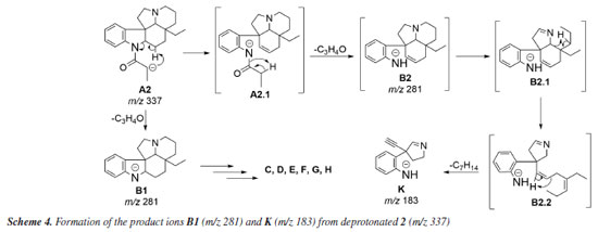 CONCLUSIONS The gas-phase fragmentation reactions of deprotonated aspidospermidine (1), demethoxypalosine (2), aspidocarpine (3), and aspidolimine (4) were investigated by accurate mass electrospray ionization tandem mass spectrometry (ESI(-)-MS/MS). Product ion spectra of deprotonated 1 and 2 provided very useful product ions at a collision energy (Elab) of 20 eV without extensive fragmentation. On the other hand, at 20 eV, only a few product ions were observed in the product ion spectrum of deprotonated 3 and 4. The main product ions result of remote hydrogen rearrangements. The most abundant product ion in the product ion spectrum of 2, 3, and 4 was the result of a ketene neutral loss (methylketene for 2 and 3, and a ketene for 4) directly from the precursor ion. The product ion of m/z 183 was diagnostic for compound 2, whereas the radical loss of •CH3 occurred only for 3 and 4, which display an aromatic methoxyl group in their structures. Although the number of product ions of deprotonated 1-4 is lower as compared with those of protonated 1-4, ESI(-)-MS/MS can be also used for the identification of the plumeran indole alkaloids 1-4 in crude extracts using LC-ESI-MS/MS, especially when the extracts are more complex.