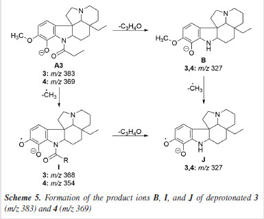 Fragmentation of deprotonated aspidocarpine (3), and aspidolimine (4) Similarly to demethoxypalosine (2), aspidocarpine (3) and aspidolimine (4) also display an acyl (4) or propionyl (3) group at the indole nitrogen. However, in the case of 3 and 4, the phenol hydroxyl is the most acidic site in the molecular structure. Therefore, the deprotomer A3 is the most stable for compounds 3 and 4. In principle, the energy transferred to the deprotonated molecules of 3 and 4 could promote a proton migration from other less acidic sites (e.g., the α-carbonyl hydrogen of the acyl group at the indoline nitrogen) to the oxygen of the phenolate ion, forming less stable deprotomers. However, this would result in the charge migration from a highly electronegative oxygen to a poorly electronegative carbon. Therefore, the low number of product ions in the spectra of 3 and 4 can be understood based on the high energy content required to convert the deprotomer A3 into A2. The product ions B, I, and J of deprotonated 3 and 4 are due to methylketene (for 3), ketene (for 4), or a methyl radical loss (for 3 and 4) from the precursor ion. The formation of these product ions occurs with charge retention, as shown in Scheme 5. Methyl radical losses have also been reported for other deprotonated phenolic compounds.45