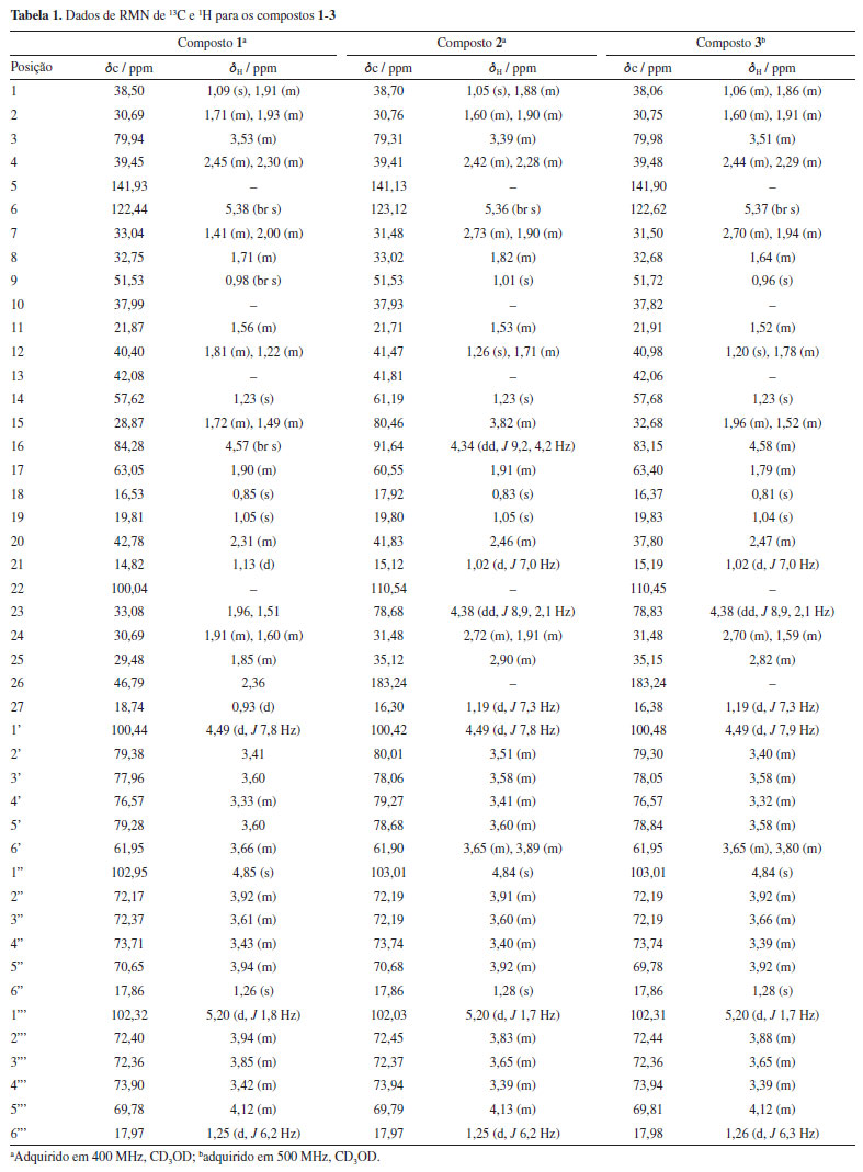 RESULTADOS E DISCUSSÃO Do extrato hidroalcoólico das partes aéreas de S. jabrense foram isolados três glicosídeos esteroidais, compostos 1, 2 e 3 (Figura 1). As estruturas foram elucidadas com base na análise de dados de infravermelho (IV), rotação óptica (RO), ressonância magnética nuclear (RMN) e espectrometria de massas de alta resolução (EMAR), além da comparação com dados disponíveis na literatura.