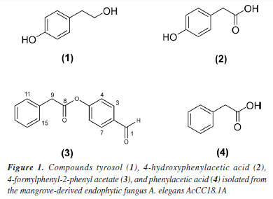 RESULTS AND DISCUSSION Isolated compounds Four compounds were isolated via silica gel column chromatography. Compounds were identified by NMR and mass spectrometry and compared with literature data for tyrosol (1), 4-hydroxyphenylacetic acid (2), 4-formylphenyl-2-phenyl acetate (3) and phenylacetic acid (4) (Figure 1).27-29