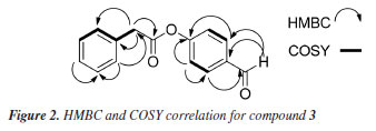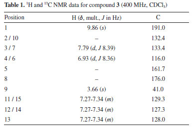 Table 1 shows 1H and 13C NMR data for 3. Based on the NMR and MS spectrometric analysis, it was possible to propose the structure of 3. Compound 3 was identified as 4-formylphenyl-2-phenyl acetate and it is the first time that 3 has been isolated as a natural product.