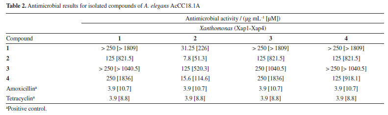 EXPERIMENTAL Microorganism For this study, we used mangrove-derived endophytic fungus A. elegans AcCC18.1A obtained from the Bioassay and Microorganism Chemistry Laboratory collection at the Federal University of Pará, for extract preparation and compounds isolation. The strains of X. axonopodis pv. passiflorae used in the tests were obtained from passion fruit plants infected by bacterial spot in crops from four different cities in Pará State, Brazil, which were: Xap1 - X. axonopodis pv. passiflorae PA1 (Igarapé-Açu), Xap2 - X. axonopodis pv. passiflorae PA5.2 (Maracanã), Xap3 - X. axonopodis pv. passiflorae PA18 (São Francisco do Pará), Xap4 - X. axonopodis pv. passiflorae PA20 (Tomé-Açu).24 The access to genetic material was registered in SISGEN (National System for the Management of Genetic Heritage) under accession number AE88252A. Culture of Actinomucor elegans on rice and compound isolation Mangrove-derived endophytic fungus A. elegans AcCC18.1A was reactivated in Petri dishes containing potato dextrose agar (PDA) medium culture for 14 days. Afterward, ten Erlenmeyer flasks (1000 mL) containing 200 g of rice and 100 mL of distilled water per flask were autoclaved for 45 min at 121 ºC. Small cubes of PDA medium containing mycelium of A. elegans AcCC18.1A were added in 7 Erlenmeyer flasks under sterile conditions. Three flasks were used as controls. After 25 days of incubation at 25 ºC, the biomass obtained was macerated with ethanol. After filtration, the solution obtained was concentrated in a rotary evaporator to obtain the biomass extracts (10.3 g). Part of the ethanol extract (6.1 g) was partitioned with ethyl acetate and hexane, yielding acetate phase (3 g) and phase hexanic (1 g) extracts after the concentration of the solutions. The ethyl acetate phase extract was fractionated on silica gel chromatographic column eluted with hexane, ethyl acetate and methanol in a polarity gradient, yielding the compounds 1-4. Antimicrobial assays The isolated compounds were tested at concentrations from 250 to 3.125 µg mL-1 using the broth microdilution method.25 In 96-well plates, 100 μL of the liquid medium BHI (brain heart infusion) was added to each well. Then, each sample was added to the first well of each column, obtaining a concentration of 250 µg mL-1. Then successive dilution was performed to obtain 3.125 µg mL-1 in the penultimate well. After, 5 μL of the bacterial suspension was added to each well and the plates were incubated for 24 h at 35 ºC. A randomized experimental design was used with three replicates. The amoxicillin and tetracyclin were used as positive controls. The activity was evaluated by adding 10 μL of 2% TTC (2,3,5-triphenyltetrazolium chloride).26 Then, to determine the type of activity, the sample was re-inoculated in Petri dishes containing solid medium BHI and incubated for 48 h at 35 ºC. When bacterial growth was observed, it was indicated that the extract and/or compound presented bacteriostatic effects at that concentration. When there was no bacterial growth, the extract and/or compound was indicated as presenting a bactericidal effect. NMR and MS data ESIMS (electrospray ionization mass spectrometry) data were acquired in positive and negative ion mode using a Thermo-Fisher Orbitrap HRLC-MS instrument. 1D and 2D nuclear magnetic resonance (NMR) spectra were recorded on a Bruker Ascend 400, using solvent (deuterated chloroform) signal as reference. Its 1H NMR frequency was 400 MHz, while for 13C NMR the frequency was 100 MHz. The chemical shifts are given in delta (d) values and the coupling constants (J) in hertz (Hz).