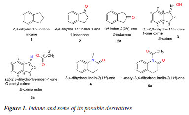 Thiago R. F. BastosI; Telma Leda G. de LemosI; Raimundo Braz FilhoII,III; Aluísio Marques da FonsecaIV I. Departamento de Química Orgânica e Inorgânica, Universidade Federal do Ceará, Campus do Pici, 60021-940 Fortaleza - CE, Brasil Received: 02/12/2025 *e-mail: fmonte@dqoi.ufc.br The reaction of (E)-2,3-dihydro-1H-inden-1-one oxime (3) with carboxylic acid anhydrides and fatty acids aiming at the formation of the respective esters unexpectedly produced imides [5a-5c and 5d-5k] (81-95% yields). This work proposes the formation of these imides from the oxime (3) through a mechanism using an oxaziridine as an intermediate, followed by a Beckmann-like rearrangement. However, in the presence of nucleophilic catalysts [dimethylaminopyridine (DMAP) and dicyclohexylcarbodiimide (DCC)] instead of electrophilic ones. Products were characterized by spectral analysis [NMR (1H / 13C) and MS (EIMS / HRMS)]. In the in silico study, the competition of some oxime derivatives was remarkable compared to galantamine (GNT) and its bioactive interactions with the main amino acid residues that are part of the site of interest of cholinesterase activity. The calculation of the physicochemical properties through molecular modeling also allowed us to understand the interaction between a ligand and its receptor, indicating the derivatives 5i, 5g, and 5h as promising acetylcholinesterase inhibitors. INTRODUCTION Indane or 2,3-dihydro-1H-indene (1) is a mixed hydrocarbon from the petroleum industry with appropriate basic structure for obtaining derivatives. Rigidity and planarity are important characteristics of the indane skeleton,1,2 present in several molecules with biological activity, such as indinavir®, an HIV2,3 (human immunodeficiency virus) protease inhibitor.3,4 This hydrocarbon can be modified in several ways, including the insertion of hydroxyl, carbonyl and carbon-carbon double bond functional groups into the pentacyclic ring. Among some of the possible derivatives (Figure 1), 1-indanone (2) is used as a base intermediate in the synthesis of several therapeutic agents such as eranz® or donepezil hydrochloride, an inhibitor of the enzyme acetylcholinesterase (AChE), used in the treatment of Alzheimer's disease.5,6