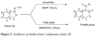 RESULTS AND DISCUSSION Synthesis and characterization of the compounds Prior to the preparation of desired esters (3a, for example; Figures 1 and 2), our attention was focused on the obtention of 2,3-dihydro-1H-indene-1-one oxime (3), easily prepared from 1-indanone (2) by reaction with hydroxylamine hydrochloride in the presence of sodium acetate. Thus, following the literature procedure,38-40 the transformation of 2 into 3 was performed at excellent yield (93%) suggesting an easy oximation stage. Then, to obtain esters, 3 was treated with carboxylic acid anhydrides in the presence of DMAP as a catalyst and then, with aliphatic carboxylic acids in the presence of DMAP with DCC as a coupling agent, according to the Steglich esterification method. Initially, the reaction with the oxime (3) (Figure 2) was investigated using acetic anhydride as an acyl group donor reagent, hoping to obtain the corresponding oxime ester 3a. The reaction, according to the literature procedure,41 occurred in the presence of DMAP as catalyst and CH2Cl2 as a solvent. Analysis of the 1H NMR spectrum showed that the product of this reaction had an acetyl group, indicated by the signal at δH 2.23 (s, 3H), which is in agreement with the 13C NMR spectrum through the two signals at δC 170.50 (C=O) and 19.90 (CH3). The fragments peaks at m/z 147 [M - C2H2O]+ (100%) and m/z 43 [CH3CO]+ (30%) in the EIMS, are also in agreement with the presence of the acetyl group. The 1H NMR spectrum also displayed signals to one isolated four-proton (-CH2-CH2-) spin fragment {d 3.00 (m, 2H); 3.04 (m, 2H)} and for four aromatic protons d 7.30 (tl, 1H), 7.34 (dl, 1H), 7.43 (t, J 7.2 Hz, 1H) and 7.90 (d, J 7.6 Hz, 1H). The 13C NMR spectrum, in turn, revealed two signals due to methylene carbons (d 28.67 and 27.84) and six signals for aromatic carbons d 149.95 and 134.49 (C-2), 132.25, 127.44, 125.82 and 123.36 (CH-4), all confirmed by distortionless enhancement by polarization transfer (DEPT) experiment. Thus, all these data would be in agreement with the formation of the desired ester, that is, 3a. However, the 13C NMR spectrum of the product, in addition to the signal at δC 170.50, recorded another well-resolved signal at δC 169.28, that is, consistent with the presence of another carbonyl group. In addition, in this spectrum, the absence of the signal around δC 164.00—corresponding to the oxime carbon (C-1) in the benz-fused cyclopentanone oxime observed in the 13C NMR spectrum of compound 3 (or 3a)—supports the presence of the molecular ion peak at m/z 189 ([M]+, 48%) and a prominent base peak at m/z 147 (100%), which can be attributed to a McLafferty rearrangement. In turn, the high-resolution mass spectrum (HRMS) suggested the molecular formula C11H11NO2 ([M]+ m/z 189.0789) and contained ion peaks at m/z 130.0657 [C9H8N]+, 148.9759 [C9H10NO]+ and 212.0683 [C11H11NNaO2]+. From these data we conclude that the product obtained was not the ester 3a, but 5a, an imide, i.e., 1-acetyl-3,4-dihydroquinolin-2(1H)-one in 95% yield (Figure 3). The chemical shifts at δC 170.50 and 169.28 were attributed to carbons C-1 and C-1', respectively, in 5a. Heteronuclear multiple bond correlation (HMBC) experiment showed the correlation of the methyl protons at δH 2.23 (CH3-1') with carbon at δC 169.28 (C-1'). In particular, in the structure of imide 5a (as in the other examples), the system 3,4-dihydroquinolin-2-(1H)-one is inserted, admitting, at first hand, that the formation of imides (5a, for example) in the present work, required the generation of amide 4 from oxime (3) (Figure 1). In fact, there are already reports in the literature19 of the formation of the amide 3,4-dihydro-2(1H)-quinolinone (Figure 2) through the rearrangement of the 1-indanone oxime via Beckmann rearrangement. Therefore, the production of imides in this work would have occurred through a reaction between 4 and carboxylic acid anhydrides (or carboxylic acids). This is unlikely, due to important theoretical and experimental aspects: (i) the very low nucleophilic power of the nitrogen of the amide and, in the case of carboxylic acids, the low electrophilic power of the carbonyl carbon, do not justify the high yields observed in the formation of imides; (ii) normally, the Beckmann rearrangement requires the presence of strong acids such as sulfuric acid or Lewis acids (SnCl4, SOCl2, PCl5, etc.), that is, it occurs under conditions of electrophilic activation of the hydroxyl group of the oxime. Nevertheless, in this study, the reactions occurred in the presence of DMAP with carboxylic acid anhydrides and DMAP/DCC with fatty acids, that is, in both cases under the action of nucleophilic agents, therefore, in basic conditions. Thus, in this work, we are proposing a hypothesized mechanism for the reaction of 3 with carboxylic acid anhydrides in the presence of DMAP using CH2Cl2 as a solvent to form imide 5a (as well as 5b and 5c) as described in Scheme 1S, presented in the Supplementary Material. First, the DMAP nucleophilic species interacts with the anhydride to generate the acylpyridinium intermediate (6). Then, the activated carbonyl carbon of the acylpyridinium is attacked by the oxime (3) to form an oxaziridine, followed by a Beckmann-type rearrangement to give imide 5a (as well as 5b, 5c). The E stereochemistry of the oxime was inferred from the nature of the imide (5a, final product), in view of the two possible regioisomeric lactams of the oxime (3). This is also in agreement with the product 5a, obtained from oxaziridine as a reaction intermediate, as the expected stereochemistry in a Beckmann rearrangement. We extended this methodology by exploring reactions of oxime (3) with other acid anhydrides (butanoic and hexanoic anhydrides). The results shown in Figure 3 reveal that the reaction worked well, providing the corresponding imides (5b and 5c) also in excellent yields. Complete 1H and 13C NMR data for compounds 5a-5c have been in the Experimental section. The 