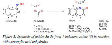 EXPERIMENTAL General experimental procedures The reagents and solvents used were purchased from Sigma-Aldrich® (Saint Louis, USA), Vetec® (Caxias do Sul, Brazil), Synth® (Diadema, Brazil) and Fluka® (Munich, Germany). Low resolution mass spectra (EIMS) were obtained on a Shimadzu GC-2010 Plus instrument coupled to a GCMS-QP2010SE mass spectrometer using capillary column (30 m × 0.25 µm) at flow rate of 1.46 mL min-1 using helium as the carrier gas; high resolution mass spectra (HRMS) were recorded on a Bruker micrOTOF II instrument - method NaFormate_ESI_pos_100-900_Lab-Mass.m. The 1H and 13C NMR (nuclear magnetic resonance) spectra were recorded on a Bruker DPX-300 spectrometer, 300 and 75.5 MHz, respectively, using CDCl3 as solvent; chemical shifts reported in ppm (d scale) with residual CHCl3 (d 7.27) as internal standard for 1H NMR and the central peak of the triplet (d 77.23) of CDCl3 for 13C NMR; spin-spin coupling constant (J) in hertz (Hz). Columns chromatography were performed using silica gel 60 (70-230 mesh, Vetec®) eluted with hexane, hexane:CH2Cl2 9:1, hexane:CH2Cl2 8:2 and CH2Cl2. The chemical reactions were monitored by analytical thin layer chromatography (TLC), performed on Merck silica gel 60 F254 plates, visualized by ultraviolet (UV) irradiation (254 nm) and by spraying with vanilin/perchloric acid/EtOH solution followed by heating. Preparation of (E)-2,3-dihydro-1H-inden-1-one oxime (3) Ketoxime (3) was synthesized from the 1-indanone, following the procedure described in literature.20 In typical preparation, a flask equipment equipped with reflux condenser was charged with 3.9 mL of EtOH, 2.8 mmol (194.46 mg) of hydroxylamine hydrochloride, 4.0 mmol (328.12 mg) of sodium acetate and 1.0 mmol (132.16 mg) of 2-indanone. The reaction system was heated at 70 ºC for 24 h and, after cooling, the white precipitate was collected by filtration, washed with water and dried to give oxime (3) (93% yield). General procedure of imides using acid anhydrides Preparation of imides 5a-5c: reactions of 3 with acid anhydrides The imides 5a-5c (Figure 3) were obtained by the reaction of the corresponding acid anhydrides a-c with the oxime (3). Thus, to a solution of 3 (100 mg, 0.68 mmol) and dimethylaminopyridine (DMAP, 23 mg, 0.2 mmol) in CH2Cl2 (8 mL) were added, in individual experiments, the acid anhydrides a, b and c (2 mmol of each), and the systems were stirred at room temperature for 2 h. Subsequently, the reaction mixtures were extracted with a 5% NaHCO3 solution (3 × 10 mL). The organic phases (dried with Na2SO4) were then evaporated in vacuo and the respective products subjected to silica gel column chromatography using CH2Cl2 as eluent to afford 5a (121 mg, 95%), 5b (133 mg, 91%) and 5c (152 mg, 92%).