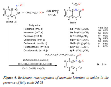 General procedure of imides using fatty acid Preparation of imides 5d-5k: reactions with fatty acids The imides 5d-5k, (Figure 4) were obtained by the reaction of the corresponding fatty acids d-k with the oxime (3). Thus, to a solution of 3 (0.68 mmol, 100 mg), dicyclohexylcarbodiimide (DCC, 268 mg, 1.3 mmol) and DMAP (1.3 mmol, 158 mg) in CH2Cl2 (3 mL) were added, in individual experiments, the fatty acids d (184 μL, 1.3 mmol), e (226 μL, 1.3 mmol), f (224 mg, 1.3 mmol), g (242 mg, 1.3 mmol), h (260 mg, 1.3 mmol), i (333 mg, 1.3 mmol), j (370 mg, 1.3 mmol) and k (410 μL, 1.3 mmol), and the systems were stirred at room temperature for 2 h. Subsequently, CH2Cl2 (10 mL) was added to the mixture, it was filtered and extracted with a 5% NaHCO3 solution (3 × 20 mL). The organic phases (dried with Na2SO4) were then evaporated and the respective products subjected to silica gel chromatographic columns using mixtures of hexane + EtOAc in increasing polarity. The pure products (5d-5k) were obtained in average yields of about 81 to 90%: 5d (154 mg, 88%), 5e (165 mg, 85%), 5f (183 mg, 90%), 5g (179 mg, 84%), 5h (198 mg, 89%), 5i (229 mg, 88%), 5j (229 mg, 82%) and 5k (225 mg, 81%).