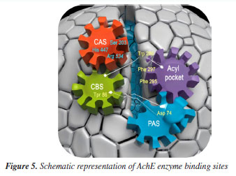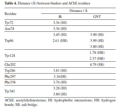 The best poses, selected based on RMSD ranking and binding energy, revealed that the complexes 5i/AChE, 5g/AChE, and 5h/AChE had RMSD values between 0.98 and 1.93 Å, and binding energies of -8.7, -8.5, and -8.4 kcal mol-1, respectively. In the redocking simulations, the GNT/AChE complex exhibited a binding energy of -6.9 kcal mol-1. All other derivatives also demonstrated favorable binding energies and RMSD values below 2 Å, surpassing the reference ligands in these metrics. The structure of AChE is characterized by several key regions that play a crucial role in its catalytic function. These include the catalytic active site (CAS), the acyl binding pocket, the choline binding site (CBS), represented by the Trp86 residue, the peripheral active site (PAS), and a narrow but deep gorge (~ 20 Å) that connects the CAS to the PAS. The CAS, located near the bottom of this gorge, is formed by the catalytic triad residues Ser203, His447, and Glu534,44 which are responsible for the hydrolysis of acetylcholine (Figure 5).