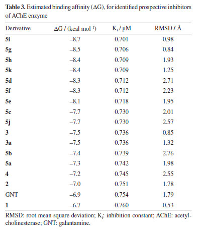 Hassner and Vazken42 observed that after the formation of O-acylurea, another reactive intermediate is formed - a symmetrical anhydride of the carboxylic acid [(RCO)2O]. In this mechanistic proposal (see Scheme 3S, in Supplementary Material), DMAP reacts with this anhydride to form the activated intermediate acylpyridinium which reacts with the oxime as shown in Schemes 1S and 2S. By analogy to the above cases, this methodology was then extending by exploring the oxime (3) reactions with other acid fatty acids [heptanoic (5d), nonanoic (5e), undecanoic (5g), hexadecanoic (5i), octadecanoic (5j) and, 5-en-octadecanoic (5k)]. The results shown in Figure 4 reveal that the reaction worked well by affording the corresponding imides (5d, 5e, 5g and 5i-5k) with high yields. All imides obtained have very similar structures, with differences only in the carbon chain originating from the carboxylic acid that reacted with oxime (3). Thus, in the 1H and 13C NMR spectra, the chemical shifts and assignments for 5b-5e, 5g and 5i-5k (see Experimental section) were compared with the respective data from 5a, 5f and 5h. In silico results Molecular docking results The molecular docking method is employed to identify potential non-covalent inhibitors of acetylcholinesterase (AChE). This computational approach, facilitated by a combination of binding affinity (kcal mol-1) and RMSD using AutoDock Vina, significantly reduces the time required to screen and identify promising compounds from extensive ligand libraries. In the initial phase of the in silico study of oxime derivatives as AChE inhibitors, a preliminary virtual ranking was established. The binding affinity score from AutoDock Vina was selected due to its strong correlation with binding affinity (primary) energy.43 Consequently, all tested derivatives were identified as the most promising ligands in comparison to the reference ligand, galantamine, following refinement through molecular docking. The RMSD was initially used for the statistical validation of the complex formation simulations and to determine the best binding pose. The RMSD is calculated by measuring the average distance between atoms of two ligand poses, with validation criteria being RMSD values close to 2 Å. All simulations (docking and redocking) produced RMSD values of 2 Å or less, with the derivative 5i/AChE complex showing a particularly low RMSD of 0.98 Å (Table 3).