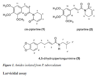 Brenda R. C. LeocadioI,II,* I. Programa de Pós-Graduação em Química, Departamento de Química, Universidade Federal do Amazonas, 69080-900 Manaus - AM, Brasil Received: 03/01/2025 *e-mail: ritasnunomura@gmail.com; brenda.leocadio@ufam.edu.br Piper tuberculatum Jacq. is known to be a promising source of amides, which have shown remarkable biological activities. In this study, a phytochemical investigation of the leaves of P. tuberculatum was conducted, leading to the isolation of the amides cis-piplartine (1), piplartine (2), and 4,5-dihydropiperlonguminine (3). The structures of the compounds were determined through the analysis of 1D and 2D nuclear magnetic resonance (NMR), mass spectrometry (MS), and high-resolution mass spectrometry (HRMS), as well as data comparison with the literature. The isolated amides were tested for acetylcholinesterase (AChE) inhibition assay and larvicidal activity against Aedes aegypti. The significant larvicidal activity of the isolated amides, along with the AChE inhibition results, indicate that the larvicidal activity is related to the inhibition of this enzyme. These results suggest that these amides are promising larvicidal compounds. INTRODUCTION The Piperaceae family is considered one of the most primitive angiosperms in the Piperales order, with a pantropical distribution. The genus Piper is the most abundant and comprises ca. 2,600 species.1-4 Some species have been used in traditional medicine against snake bites, insect control, and as analgesics or anti-inflammatory agents.5 The Piper species has attracted interest in the investigation of various classes of secondary metabolites, including amides, propenylphenols, lignans, neolignans, terpenes, steroids, flavones, and flavanones. Among these metabolites, amides are among the most abundant constituents in many Piper species.6-8 Several amides have been isolated from Piper, including those with isobutyl, pyrrolidine, dihydropyridone, and piperidine-type structures.9 These amides exhibit a wide range of biological activities, including anticancer,10 anxiolytic,11 and particularly promising larvicidal compounds.12 Amides isolated from Piper have shown effectiveness in mosquito control, such as Aedes aegypti, making them an interesting alternative for the development of biological and sustainable control methods against the spread of mosquito-borne diseases, such as dengue, Zika, and chikungunya.13 Some commercial insecticides, essential oils, and isolated compounds demonstrate larvicidal activity due to their effect on the cholinergic system, particularly through the inhibition of acetylcholinesterase (AChE), which has become a promising alternative for investigating the larvicidal mechanism of action of various natural products, such as essential oils and isolated compounds.10 However, it is important to highlight that insect AChE has a distinct feature compared to mammalian AChE: many insect species possess a cysteine near the active site, which is absent in mammalian AChE.14 This structural difference is crucial, because it allows the development of selective inhibitors, more effective targeting insects, while minimizing risks to non-target organisms, such as mammals.15 Therefore, to investigate the action of AChE inhibitors as insecticidal agents, it is essential to consider the specificity of insect cysteine, which enables the creation of safer and more targeted compounds that reduce negative impacts on mammals and other non-target organisms.10,16,17 Among the Piper species, P. tuberculatum Jacq., is a typical Amazonian species, popularly known as “monkey pepper", “long pepper", or “pimenta-d'Arda". This species is widely used in traditional medicine by natives, who prepare infusions from its fruits and leaves as analgesics, sedatives, as well as an antidote for snake venom and stomach issues.18 Phytochemical studies on fixed constituents of the species report a predominance of amides. Among these amides, piplartine stands out due to its significant larvicidal potential.19 In addition, this species exhibits various biological activities, such as anticancer,10 antifungal,20 and anxiolytic effects.11 Although the larvicidal activity of Piper tuberculatum against some vectors of tropical diseases is known, the mechanism of action is still poorly understood. Since AChE inhibition is often associated with larvicidal activity, this study aims to elucidate this mechanism, emphasizing the effect of the compound on AChE. In this context, the present study investigated the larvicidal activity against Aedes aegypti of the amides isolated from P. tuberculatum and determined the AChE inhibition of the isolated compounds.