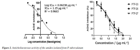 Acetylcholinesterase (AChE) inhibition assay The mechanism of action was investigated by measuring AChE inhibition using a modified spectrophotometric method.22,23 Neostigmine (1 mg), used as a positive control, and AChE from Sigma-Aldrich (10 μL) were prepared in phosphate buffer (1 mL) at 0.1 M, pH 8. The isolated compounds (1 mg) were dissolved in MeOH (1 mL) and evaluated at concentrations ranging from 0.07 to 10 ppm. The assay was performed in triplicate using a 96-well microplate incubated in a light-protected environment for 15 min. Negative and positive controls were evaluated under the same conditions. The absorbance at 405 nm was read every 5 min for 30 min using a microplate reader (ELx800, Biotek, USA). The percentage of inhibition at each concentration was calculated using the Equation 2: Inhibition (%) = A2 - (A1 - A3) × 100 / A2 (2)