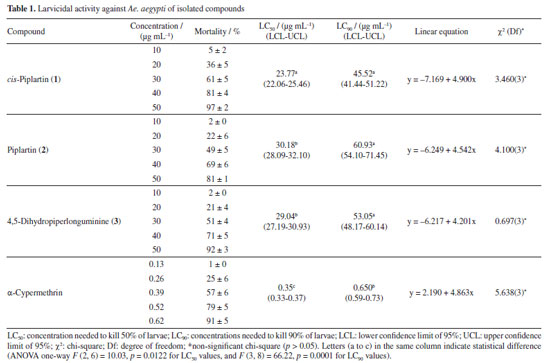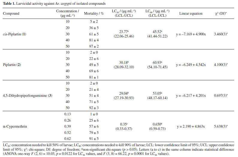 The isolated compound 2 was also a white crystal. Its molecular formula was determined by HRMS ([M + H]- m/z 318.1331) as being C17H20NO5) (Figure 6S, Supplementary Material). In the DI-APCI-MS analysis, the ion at m/z 318 [M + H]+ was observed as the base peak, and upon fragmentation, an initial loss of 97 Da (m/z 221) was detected (Figure 7S, Supplementary Material). Comparative MS and NMR analyses revealed structural similarity to compound 1. However, the 1H NMR spectrum (Figure 8S, Supplementary Material) showed a difference in the coupling constants between the olefinic protons H-8 (1H, d) and H-9 (1H, d), both with J 15.6 Hz, characteristic of vicinal trans protons. Based on spectral data analysis and literature comparison,24 compound 2 was identified as piplartine (Figure 1). The compound 3 was isolated as a yellow crystal. Its molecular formula was determined by HRMS in positive mode as C16H22NO3 ([M + H]+ m/z 276.1594). In the DI-APCI-MS analysis (Figure 10S, Supplementary Material), the ion at m/z 276 [M + H]+ was observed as the base peak. Upon fragmentation, it exhibited losses of 73 Da (m/z 203), 141 Da (m/z 135), and 115 Da (m/z 161) (Figure 11S, Supplementary Material). The 1H NMR spectrum (Figure 12S, Supplementary Material) displayed characteristic signals for aromatic protons at dH 6.64 (dd, H-6') and 6.69-6.71 (m, H-2'/H-5'), along with a singlet at dH 5.88, corresponding to protons from the methylenedioxy group. Additionally, signals in the region of olefinic proton resonances were observed at dH 6.76 (dt, H-3) and 5.89 (dt, H-2), indicating trans coupling. Proton resonance signals in the aliphatic region (dH 1.45-3.20) were also identified. The methylenedioxy group was confirmed through 3J couplings for the proton at dH 5.88 (s) with the carbons at dC 145.5 and 147.5, as observed in the heteronuclear single-quantum correlation (HSQC) experiment (Figure 13S, Supplementary Material). Therefore, after analysis of spectral data and comparison with previously reported data in the literature,24,25 the compound was identified as 4,5-dihydropiperlonguminine amide (Figure 1). Larvicidal assay The results of the larvicidal activity of the isolated amides against Ae. aegypti larvae are shown in Table 1. The data obtained on the number of dead larvae were analyzed based on the lethal concentration 50% (LC50) and lethal concentration 90% (LC90).