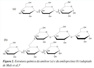 Diversas matrizes renováveis de biopolímeros estão atualmente sendo estudadas para a produção de plásticos biodegradáveis, incluindo quitosana,13 celulose14 e uma fonte bastante promissora, o amido ou fécula. A diferença entre amido e fécula está relacionada apenas à sua origem: o amido pode ser obtido de diversas fontes vegetais, como cereais, enquanto as féculas são extraídas de raízes e tubérculos. Tanto os amidos quanto as féculas são polissacarídeos de reserva dos vegetais, armazenados sob a forma de grânulos que apresentam um certo grau de organização molecular. Essa organização confere a esses materiais um caráter parcialmente cristalino ou semicristalino, com grau de cristalinidade variando de 20 a 45%.9,15 Dentre as diversas fontes de amido, o milho se destaca em escala global, com produção anual estimada em mais de um bilhão de toneladas. Sua abundância favorece o amplo uso na indústria alimentícia. Contudo, o aproveitamento do amido de milho para a fabricação de bioplásticos em larga escala pode gerar riscos de escassez e impacto socioeconômico. Por esse motivo, há um crescente interesse na busca por fontes alternativas de amido, mais sustentáveis e com menor competição com a cadeia alimentar.16 Nesse contexto, a raiz de araruta (Maranta arundinacea), originária da América do Sul,17 surge como uma opção viável devido ao seu baixo custo, menor impacto econômico e à composição rica em polissacarídeos, como amilose e amilopectina, que conferem propriedades estruturais favoráveis à fabricação de filmes biodegradáveis. A proporção entre amilose e amilopectina no amido influencia as propriedades dos filmes produzidos a partir desse biopolímero. Filmes com maior teor de amilose tendem a exibir maior rigidez, menor elasticidade, reduzida permeabilidade ao oxigênio, maior capacidade de retenção de água e propriedades de barreira mais eficientes. Essas características podem ser atribuídas à estrutura linear e compacta da amilose, que em contraste com a amilopectina altamente ramificada, favorece a formação de regiões cristalinas durante o processo de secagem do filme.18,19 Além do potencial para reduzir a dependência de polímeros sintéticos, a utilização da araruta na produção de bioplásticos pode estimular seu cultivo, promovendo a diversificação agrícola e impulsionando a economia do setor. Segundo a Empresa Brasileira de Pesquisa Agropecuária,20 essa cultura representa uma alternativa promissora para pequenos e médios produtores, especialmente quando integrada a sistemas de cultivo consorciado, como com o milho, permitindo o uso mais eficiente do solo e contribuindo para a sustentabilidade da produção agrícola. As féculas possuem características únicas atribuídas à sua estrutura em pequenos conglomerados individuais conhecidos como grânulos, compostos pelas macromoléculas de amilose e amilopectina (Figura 2), configuradas de maneira alternada.