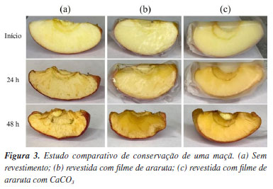 Após a obtenção dos filmes poliméricos, foi realizado um teste para avaliar a capacidade de conservação de alimentos. O teste consistiu em utilizar uma maçã, cortada em três partes, e comparar o envelhecimento nas seguintes condições: sem nenhum revestimento (Figura 3a), revestida com filme plástico de araruta (Figura 3b) e revestida com filme plástico de araruta com CaCO3 (Figura 3c). Observamos a aparência inicial e comparamos após 24 e 48 h. Pode-se dizer que o filme com adição de CaCO3 em condições ambientes apresentou melhor desempenho quanto à permeação a gases e ao vapor d'água, quando comparado com o filme contendo apenas araruta, possibilitando, desta maneira, prolongar. a vida de prateleira de alimentos suscetíveis à degradação por O2 (oxidação).