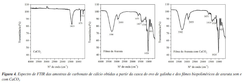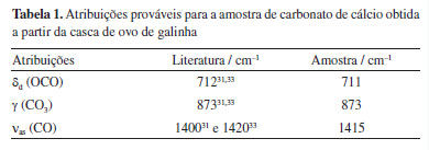 O FTIR da amostra de CaCO3 está ilustrado na Figura 4. Podem ser observadas três atribuições vibracionais do CaCO3 referentes à fração calcita: deformação angular no plano δd (OCO) em 711 cm-1; deformações angulares fora do plano γ (CO3) em 873 cm-1 e estiramento antissimétrico νas (CO) em 1415 cm-1.