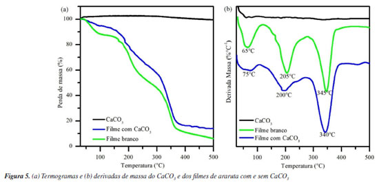 Os espectros de FTIR também tiveram o objetivo de auxiliar a identificar possíveis interações entre os constituintes do material, em especial o CaCO3 (reforço) e a fécula de araruta (matriz polimérica). A análise comparativa foi realizada entre três amostras: CaCO3, filme de araruta e filme de araruta com adição de CaCO3. Os espectros obtidos são apresentados na Figura 4. Os resultados revelaram algumas variações e deslocamentos discretos. A banda atribuída ao estiramento axial das ligações O-H, presente na região de 3300 cm-1 no filme de araruta sem CaCO3, deslocou-se para 3302 cm-1 com a adição do CaCO3, indicando uma possível interação física entre os grupos hidroxilas do amido e o enchimento. Além disso, a banda associada ao grupo C-H apresentou uma leve variação, passando de 2935 cm-1 no filme sem CaCO3 para 2933 cm-1 na formulação com CaCO3. Para o grupo C-O, também se observou um deslocamento de 1028 cm-1 para 1024 cm-1, respectivamente. Essas variações podem indicar alterações no ambiente químico local dessas ligações.34 A comparação dos espectros FTIR demonstrou que os filmes à base de fécula de araruta e CaCO3 apresentam bandas características similares às de suas matérias-primas, sem surgimento de novos grupos funcionais. Esse comportamento sugere que as interações entre a fécula de araruta e o CaCO3 são predominantemente físicas, não envolvendo reações químicas que levem à formação de novas ligações covalentes. A ausência de bandas adicionais ou deslocamentos significativos reforça a hipótese de compatibilização física entre os constituintes, sendo o CaCO3 incorporado ao sistema sem modificar quimicamente a estrutura da matriz polimérica. Estabilidade térmica A estabilidade térmica de um material pode ser aferida mediante análises TGA e DTG, nas quais a massa da amostra em uma atmosfera controlada é registrada continuamente como uma função do tempo, à medida que a temperatura aumenta. Isso permite estudar em detalhes as alterações que o aquecimento pode provocar nas substâncias.33 Os termogramas apresentados nas Figuras 5a e 5b mostram o comportamento térmico do carbonato de cálcio obtido, assim como dos filmes biodegradáveis à base de araruta, com e sem carbonato de cálcio.