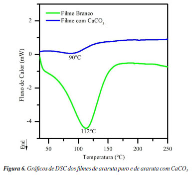 Com isso, foi possível observar o efeito do CaCO3 no filme de araruta, proporcionando maior estabilidade térmica e melhor conservação da quantidade de plastificante na matriz polimérica. Em um termograma de DSC, picos exotérmicos e endotérmicos caracterizam transições ou reações que tenham ocorrido durante a análise, como transição vítrea (Tg), gelatinização, fusão (Tf), oxidação e decomposição, entre outras.36 A Figura 6 ilustra o gráfico com as curvas de DSC para os filmes de araruta com e sem CaCO3, onde foi possível observar apenas um evento endotérmico para as duas amostras em 90 e 112 ºC, respectivamente. Não foi possível observar a Tg dos filmes formulados (que é caracterizado por um desvio na linha de base no sentido exotérmico). Alguns trabalhos na literatura37 apresentam a Tg de filmes à base de amido em regiões de temperatura negativa, faixa de temperatura que não pode ser obtida no equipamento de DSC utilizado para a análise nesse trabalho.