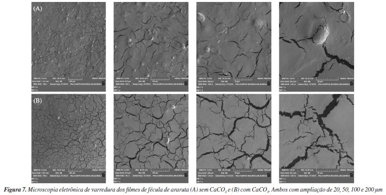 Baixos valores de Tg sugerem uma estabilidade relativamente baixa do material, por causa da alta mobilidade molecular dos seus componentes. Por outro lado, também mostra uma boa flexibilidade do filme em temperaturas de refrigeração e/ou congelamento, o que pode ser uma vantagem quando se considera o potencial de aplicação como material de embalagem de alimentos.38 O pico endotérmico presente nas duas amostras é referente a Tf, onde é possível observar um leve deslocamento para valores menor quando adicionado o CaCO3, ao mesmo tempo que ocorre a diminuição da intensidade do pico, implicando em menos energia necessária para esta transição de fase, devido a menor proporção de fase cristalina no composto e consequentemente maior fase amorfa,39 o que pode contribuir para uma maior permeabilidade de gases.40 Análise morfológica dos filmes As características da estrutura morfológica de biofilmes poliméricos são fatores que podem e devem ser estudados na confecção desse tipo de material. Uma das maneiras viáveis de realizar essa análise é o uso da microscopia eletrônica de varredura (MEV), que, por meio de um feixe focalizado de elétrons, permite a visualização de uma imagem ampliada em até 300.000 vezes da superfície de uma amostra de bioplástico.41,42 A análise morfológica dos filmes revelou características superficiais semelhantes entre as amostras, destacando-se a presença de rachaduras e grânulos de fécula parcialmente ou não gelatinizados (Figura 7). As rachaduras visíveis podem ter origem no manuseio dos filmes durante as etapas anteriores à caracterização, além de possivelmente estarem associadas à liberação de bolhas de ar durante o processo de secagem. Observou-se, ainda, uma incidência mais acentuada dessas rachaduras no filme contendo carbonato de cálcio (CaCO3), o que pode estar relacionado aos resultados do ensaio de DSC (Figura 6), em que a maior presença de defeitos estruturais está associada a uma fase amorfa predominante.