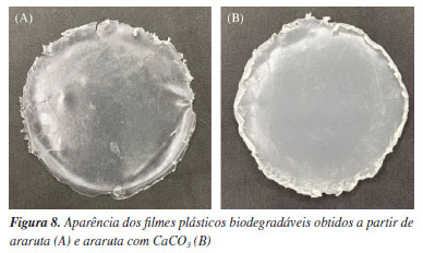 Por outro lado, as imagens obtidas por microscopia eletrônica de varredura (MEV) indicam que os filmes contendo CaCO3 apresentaram uma menor quantidade de grânulos de fécula visíveis, sugerindo que a adição do carbonato contribuiu para uma maior solubilidade e dispersão dos grânulos na matriz polimérica. Esse comportamento pode favorecer uma melhor integração do amido à estrutura do filme, apesar da presença de descontinuidades. Aparência dos filmes e teste de conservação de alimentos Análises visuais e táteis foram realizadas para selecionar os filmes mais homogêneos e flexíveis para manuseio. Filmes que não exibiam tais características foram rejeitados. Os filmes obtidos mostraram homogeneidade, sem a presença de partículas insolúveis ou bolhas de ar, e nenhuma ruptura após a secagem. Diferentemente dos filmes feitos apenas com araruta (Figura 8A), o filme com CaCO3 (Figura 8B) apresentou uma leve opacidade. No entanto, exibiu melhor flexibilidade e manuseio, sendo facilmente removido das placas. Além disso, a superfície em contato com a placa era relativamente mais suave, com maior brilho e melhor aderência.