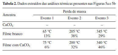 O termograma presente na Figura 5a mostra que o CaCO3 até 500 ºC demonstrou um comportamento linear no decorrer de toda a análise, apresentando uma perda de massa de aproximadamente 0,5%. A curva de DTG na Figura 5b confirma esse comportamento. Esta baixa perda de massa encontrada pode estar associada a total remoção da membrana aderida à casca de ovo, por ela ser constituída de carboidratos e proteínas, ou seja, rica em matéria orgânica. As curvas TGA e DTG das amostras de filmes de araruta, com e sem CaCO3, revelaram a existência de três eventos térmicos, correspondentes à eliminação da água, decomposição do glicerol e decomposição do amido, respectivamente (Tabela 2).35 Em geral, verificou-se que os componentes do filme não interferem no mecanismo de degradação térmica dos componentes puros. O primeiro evento ocorreu entre 65 e 75 ºC, com uma perda média de massa de 13 e 6%, respectivamente, representando a evaporação da água presente na matriz do filme. O segundo evento, entre 200 e 205 ºC, correspondeu à decomposição do glicerol, com uma perda média de massa de 38 e 32%. O terceiro evento, ocorrido entre 340 e 345 ºC, foi atribuído à degradação da molécula de amido.
