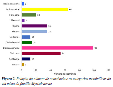 Os metabólitos especiais ocorrentes na via mista foram distribuídos em 12 categorias distintas: aurona, arilflavana, chalconas, diarilpropanóides, diidroflavonol, estilbenos, flavana, flavona, flavonol, flavonona, isoflavonoide e proantocianidina, respectivamente. Notou-se a ocorrência de aurona somente nos gêneros Horsfieldia e Knema, enquanto de chalconas foi observada em Horsfieldia, Iryanthera, Myristica e Virola. Apenas Pycnanthus não possuiu chalconas e nem diarilpropanoides. Vale ressaltar que as auronas, chalconas e diarilpropanóides são considerados marcadores de primitividade, mas não são comuns em todos os gêneros bioprodutores de micromoléculas da via mista, sendo pouco distribuídos na família Myristicaceae, revelando que há diferenças evolutivas entre os gêneros que possuem essa rota biossintética. O gênero Iryanthera é o que possui maior bioprodução de chalconas e diarilpronanóides, característica de angiospermas basais, indicando que determinadas rotas biossintéticas desse gênero foram preservadas, portanto, este gênero manteve características bioquímicas antigas ao longo da evolução. Essas características provavelmente foram mantidas devido a localização dessas espécies, que encontram-se, preferencialmente, na parte dossel superior das florestas, áreas de pouca competição de luz solar e de difícil acesso, portanto, o ambiente dessas espécies está mais preservado, não precisando criar meios de sobrevivência, rotas biossintéticas, muito diferente do que já são acostumadas.29-31 Verificou-se a ocorrência de isoflavonóides e flavona, metabólitos mais evoluídos32 nos seis gêneros dessa via, principalmente, nos gêneros Knema e Virola. As espécies do gênero Knema são nativas de regiões sub-tropicais da Ásia e ilhas do Pacífico, vivem nos sub-bosques das florestas tropicais úmidas, cujo habitat tem menor incidência de luz, ocorrendo competição entre as espécies e consequentemente ao crescimento lento das mesmas. Os sub-bosques também são as regiões preferidas de fungos e bactérias, então, esse vegetal acaba se especializando mais na defesa química.33 Por outro lado, o gênero Virola é encontrado nas florestas tropicais da América do Sul, especialmente na região amazônica e atingem o dossel superior das florestas. Essas espécies crescem rápido para procurar luz, então, se preocupam mais em crescer do que em se defender como ocorre com Knema, porém, as árvores do gênero Virola são muito conhecidas por sua madeira de qualidade, o que as torna alvo de exploração madeireira, representando uma ameaça para a biodiversidade da região. Provavelmente, esse fato fez com que esse gênero começasse a criar mecanismos bioquímicos para sua sobrevivência na floresta.34,35 Esse estudo quimiossistemático revelou que os gêneros Knema e Virola possuem metabólitos da via mista mais especializados, mais evoluídos que os demais gêneros dessa família, mesmo a família apresentando um quantitativo baixo de flavonol que também indica avanço evolutivo. Assim, o número de ocorrência das categorias metabólicas da via mista está disposto na Figura 2.