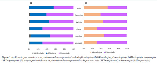 As micromoléculas oriundas da via mista presentes em Myristicaceae apresentaram uma ampla diversificação estrutural conforme ilustrados na Tabela 3. O metabólito mais abundante é 2',4'-diidroxi-4,6'-dimetoxidiidrochalcona (5) da categoria das chalconas, característica de primitividade das espécies e a proantocianidina A1 (13) é a menos ocorrente. Por outro lado, a categoria molecular mais abundante é diarilpropanoide, tendo o metabólito 1,3-benzenediol,4-[3-(6-methoxy-1,3-benzodioxol-5-yl)propyl] (6) como mais abundante. Adicionalmente, as micromoléculas que apresentaram proteção fenólica contra oxidação por O-metilação foram as 5, 6, 7, 8 e 1, já as com proteção contra oxidação por O-glicosilação foram apenas nos metabólitos 2 e 11, no entanto, a família é caracterizada, majoritariamente, por apresentar suas hidroxilas desprotegidas da ação oxidativa. A proteção fenólica dos flavonoides de Myristicaceae corresponde aos parâmetros de avanço evolutivo de proteção contra o estresse oxidativo e desproteção do anel aromático, ficando suscetível à oxidação, também chamados de índices químicos moduladores. Parâmetros de avanço evolutivo Os metabólitos oriundos da rota biossintética mista da família Myristicaceae são majoritariamente desprotegidos da ação oxidativa, mas quando apresentaram proteção fenólica contra oxidação, ocorreu preferencialmente pelo grupos O-metilação e/ou O-glicosilação, conforme ilustrado na Figura 3.