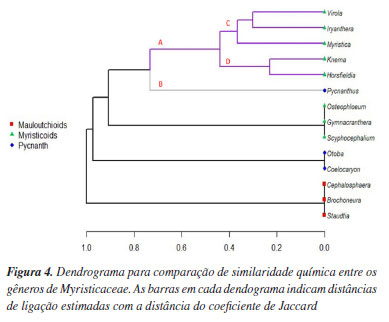 Os metabólitos especiais dos gêneros Horsfieldia e Knema são os mais desprotegidos, ambos com 69,82% de desproteção, enquanto em Virola, os metabólitos são mais protegidos (55,32%). A proteção por O-metilação dessas micromoléculas é mais abundante no gênero Virola (55,32%), seguido por Iryanthera (52,97%), Myristica (42,58%), Pycnanthus (36,11%), Horsfieldia (28,99%) e Knema (28,99%). A proteção por O-glicosilação é mais abundante em Iryanthera (3,21%), percebendo uma preferência pelo mecanismo de proteção por O-metilação nos metabólitos. Uma das características de angiospermas basais é a ausência de proteção fenólica, mas, embora a maioria das hidroxilas dos flavonoides dessa via sejam desprotegidas, notou-se um aperfeiçoamento em um mecanismo de proteção fenólica, alcançando mais de 40% de proteção total. Similaridade química dos gêneros da família Myristicaceae A partir dos parâmetros quimiossistemáticos da família Myristicaceae, especificamente, dos metabólitos especiais da via mista dos gêneros Horsfieldia, Iryanthera, Knema, Myristica e Virola (clado Myristicoids), e, Pycnanthus (clado Pycnanthus), foi possível analisar a similaridade entre esses gêneros e seus respectivos clados por meio da análise quimiométrica como ilustrado na Figura 4.