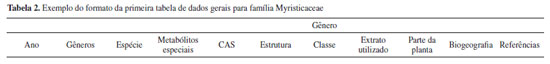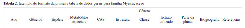 PARTE EXPERIMENTAL A metodologia aplicada neste trabalho foi desenvolvida pelo professor Otto Gottlieb23,24 e seu grupo de pesquisa, recentemente revisada por nosso grupo de pesquisa Sousa25 e Batista.26 Inicialmente, realizou-se um levantamento bibliográfico a respeito de cada gênero da família Myristicaceae, utilizando o Chemical Abstracts para acessar as principais obras de referência disponibilizadas no indexador Scifinder, abrangendo o período de 1945 até 2022, empregando como palavras-chaves os nomes de cada gênero da família Myristicaceae: Bicuida, Brochoneura, Cephalosphaera, Coelocaryon, Compsoneura, Doyleanthus, Endocomia, Gymnacrantera, Haematodendron, Horsfieldia, Iryanthera, Knema, Maulotchia, Myristica, Osteophloeum, Otoba, Paramyristica, Pycnanthus, Scyphocephallum, Staudtia e Virola. Após análise criteriosa dos artigos publicados que realizaram estudos fitoquímicos dos gêneros da Myristicaceae, organizou-se as informações na primeira planilha eletrônica (Excel, Microsoft Corporation, versão 365) de dados gerais da família, visando delinear o perfil químico dos gêneros. Essa tabela foi estruturada em colunas identificadas por ano de publicação dos artigos, gêneros, espécies, nomes dos metabólitos especiais identificados, CAS, estrutura molecular, classe, tipo de extrato utilizado para o isolamento dos metabólitos especiais, parte da planta que foi isolada a micromolécula, a região geográfica que foi coletada o vegetal e as referências conforme mostra o exemplo da planilha na Tabela 2.