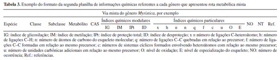 Depois do preenchimento dos dados da primeira planilha, filtrou-se as informações químicas principais de cada gênero da família e desenvolveu-se a segunda planilha eletrônica, a qual foi inserida informações dos metabólitos especiais oriundos da via mista de acordo com cada gênero, a estruturação dessa planilha é representada na Tabela 3.