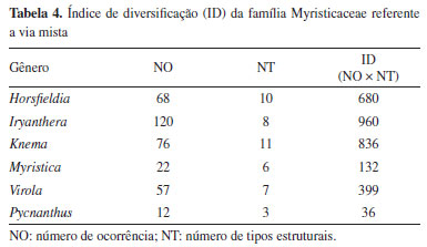 Observa-se a presença preponderante de diarilpropanóides (NO = 99), seguido de isoflavonoides (NO = 64) e chalconas (NO = 54), enquanto o número de ocorrência de flavana e flavona foi de 35. A menor abundância das micromoléculas da via mista está nas categorias da aurona e proantocianidina (NO = 3), flavonol (NO = 4), arilflavana e estilbenos (NO = 12), diidroflavonol (NO = 14) e flavonona (NO = 20), revelando baixa ocorrência de metabólitos mais especializados. Relação flavona/flavonol Um dos principais parâmetros que relacionam as características químicas e morfológicas em um táxon é a relação entre os números de ocorrências de flavona (fo) e flavonol (fl). Essa razão fo/fl pode ser correlacionada aos índices de Sporne (IS) e herbacidade (IH) em um táxon. Em Myristicaceae a razão fo/fl foi de 8,75, o índice de Sporne é de 34, e o de herbacidade é de 12,5. De acordo com Geraldo e Kaplan,36 a maioria dos táxons arbóreos e arbustos que possuem IH ≤ 50, IS ≤ 55 e fo/fl < 1, são morfologicamente mais primitivos. Isso indica que a família Myristicaceae é uma das famílias mais primitivas de angiospermas (IS = 34) e ainda revela que é extremamente lenhosa, tendo o predomínio de árvores sobre arbustos, pois seu índice de Sporne é 12,5, portanto, menor que 25. Em contrapartida, a razão fo/fl em Myristicaceae é maior que 1 (8,75), indicativo que a família produz mais flavona que flavonol, o que é uma tendência em famílias mais evoluídas contradizendo o que demonstra os índices de Sporne e herbacidade da família. Esse resultado também contraria a teoria de que é raro, em táxons extremamente lenhosos, a razão fo/fl ser maior que 1, geralmente, essa razão é inferior a 1, o que corrobora com relatos anteriores na literatura, os quais destacam a complexidade e a dificuldade em se estabelecer relações morfológicas consistentes dentro da família Myristicaceae.36 Ao analisar os gêneros de Myristicaceae que bioproduzem flavonas e flavonóis, destaca-se apenas Iryanthera (NOflavona = 4 e NOflavonol = 1) cuja razão fo/fl é de 4, e Knema (NOflavona = 10 e NOflavonol = 3) com a razão fo/fl de 3,33, portanto, nesse requisito, os gêneros seguem a mesma linha geral da família. Não foram identificados a presença de flavonóis para os demais gêneros analisados Horsfieldia, Myristica, Virola e Pycnanthus. Em geral, os flavonoides são importantes marcadores quimiossistemáticos. Famílias da mesma ordem Magnoliales, geralmente, apresentam elevadas ocorrências de micromoléculas oriundas da via mista, indicando que estão aprimorando sua biossíntese, que continuam evoluindo, o que não é amplamente observado em Myristicaceae, pois há baixa ocorrência de micromoléculas da via mista (chiquimato/acetato) e alta ocorrência de metabólitos da via do chiquimato. Sem embargo, o metabólito especial mais abundante da via mista é o diarilpropanóide, considerado um marcador quimiotaxonômico de primitividade das plantas. Índice de diversificação molecular e categorias metabólicas Os seis gêneros aqui estudados apresentaram boa variabilidade estrutural, apresentando um índice de diversificação total de 3043 como demonstrado na Tabela 4.
