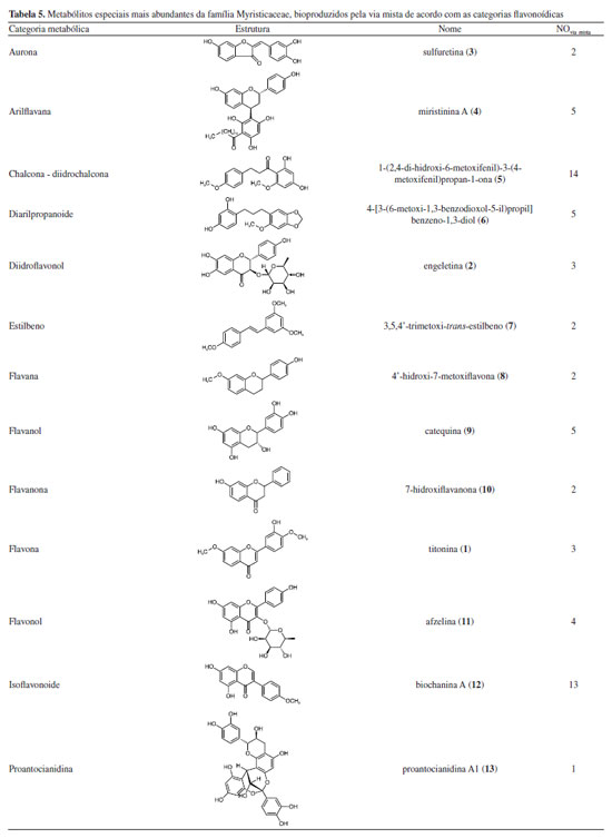O gênero Iryanthera revelou maior índice de diversificação do esqueleto apesar de apresentar menor número de categorias estruturais quando comparado ao Knema, isso poderia indicar que Iryanthera é mais evoluída que Knema, porém Iryanthera é superabundante em metabólitos que sinalizam a primitividade das espécies como chalcona e diarilpropanoide, enquanto Knema apresenta metabólitos mais especializados. Isso pode indicar uma provável estagnação quanto à diversificação dos esqueletos micromoleculares de Iryanthera. É notória a baixa ocorrência de metabólitos especiais da via mista e a baixa diversidade molecular do gênero Myristica nesta via. As principais categorias metabólicas bem como os metabólitos mais abundantes bioproduzidos pela via mista em Myristicaceae são demonstrados na Tabela 5. É importante destacar que não foi considerada a estereoquímica das estruturas químicas apresentadas na Tabela 5.