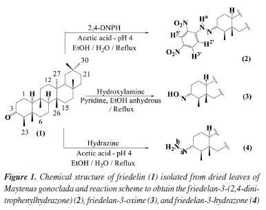 EXPERIMENTAL Plant material Leaves of Maytenus gonoclada (Celastraceae) were collected in "Serra da Piedade", Minas Gerais, Brazil. A voucher specimen (No. HBCB 60280) was preserved in the Herbarium of Instituto de Ciências Biológicas, Universidade Federal de Minas Gerais, Brazil. The botanical material accessed was registered at Sistema Nacional de Gestão do Patrimônio Genético e do Conhecimento Tradicional Associado (SisGen), of Ministério do Meio Ambiente, Brazil, under number AFBF625. Obtention and identification of friedelin and its N-derivatives The friedelin (1) was isolated from leaves of Maytenus gonoclada following the procedure described by Silva et al.31 To obtain the N-derivative 2, friedelin (100.0 mg), 2,4-dinitrophenylhydrazine, and drops of acetic acid p.a. were added to a 50 mL round-bottom flask containing an ethanol/water mixture until pH 4. The reaction mixture was kept at reflux until the respective nitrogenous derivative was obtained. In this case, the reaction medium was adjusted to approximately 136 ºC to produce friedelan-3-dinitrophenylhydrazone (2) in syn conformation (synperiplanar) and not as a syn-anti mixture (2:1). The reaction was monitored by silica gel thin layer chromatography (TLC). After cooling, an aqueous NaHSO4 5% w/v solution was added until the product precipitated. The solid material was filtered and washed with distilled water, according to Rangaswami and Sambamurthy32 (yield 83%). For the synthesis of derivative 3, a mixture containing friedelin (100.0 mg), anhydrous ethanol, hydroxylamine, and pyridine was kept under reflux and monitored by TLC. After cooling, distilled water was added until the product precipitated. The solid material was filtered and washed with distilled water33 (yield 93%). To obtain derivative 4, a mixture containing friedelin (100.0 mg), hydrazine, and drops of acetic acid p.a. was added to a 50 mL round-bottom flask containing an ethanol/water mixture until pH 4. The reaction mixture was kept at reflux until the formation of the respective nitrogenous derivative was verified by TLC33 (yield 55%). The reaction conditions and yields of N-derivatives 2-4 obtained from friedelin (1) isolated from leaves of Maytenus gonoclada are shown in Table 1S (Supplementary Material). The chemical characterization of nitrogenated compounds 2, 3, and 4, obtained from friedelin (1) (Figure 1), was carried out through analyses of infrared (IR) and hydrogen and carbon nuclear magnetic resonance (1H and 13C, DEPT-135 and 2D NMR) spectral data (available at Supplementary Material, Figures 1S to 20S, and Table 2S). As a purity criterion of N-derivatives 2, 3, and 4, obtained from friedelin, was considered the visualization of a single spot in TLC carried out with eluents of different polarities and similarity of IR and 1H and 13C NMR results with already published data. In silico prediction of antileishmanial activity Selection of datasets related to Leishmania species and their biological targets We searched the PubChem Bioassay website for "Leishmania". After manual filtering, the remaining bioassay was classified and grouped according to Leishmania species, infecting form (amastigotes or promastigotes), and specific biological targets (Figure 4, Dataset Preparation). After filtering, 954 bioassays were analyzed and grouped into 10 datasets (Table 3S, Supplementary Material). The filtering process and composition of the Leishmania datasets are detailed in the Supplementary Material. Table 4S (Supplementary Material) includes the values of the area under the ROC (receiver operating characteristic) curve obtained in the validation process for each model built from those datasets. Most models have achieved a very good performance, as measured by the area under the ROC curve (AUC). Considering both methods, 70% of models had an AUC above 0.9, 15% between 0.8 and 0.9, and 15% between 0.7 and 0.8 (Table 4S).