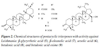 RESULTS AND DISCUSSION Pentacyclic triterpenes (TTPs) are natural compounds that show various biological activities, including antiprotozoal, anticancer, anti-inflammatory, and hepatoprotective effects.19,20 However, TTPs have some limitations that limit their therapeutic application in clinical use.21 Several triterpenoid derivatives with many skeletal modifications have been developed to improve the solubility and other pharmacokinetics (absorption, distribution, metabolism, excretion, and toxicity - ADMET) properties. One of these modifications involves forming analogues or derivatives of TTPs with the nitrogen group.22 Most of the structural modifications of friedelin occur in the C3 (A-ring) due to the 3-keto group, the only chemically active functional group in the molecule. Thus, using the Active-IT system, N-derivatives of friedelin were planned and evaluated in silico against the Leishmania amastigote and promastigote forms. Subsequently, the compounds were synthesized and tested in vitro to validate our approach further. In silico prediction of antileishmanial activities The Active-IT system utilizes information from the PubChem databases, specifically the BioAssay and Compound databases.23 The PubChem BioAssay covers a wide range of biological entities and tests, while the 3D structure of compounds is obtained from the PubChem Compound database.24 The 3D-Pharma module25 converts molecular structures into 3D pharmacophore fingerprints. The selected compounds were submitted to the Leishmania models we built using the ExCVBA module of Active-IT.26 For this work, we downloaded all 3D structures (up to ten conformations) of friedelin and its N-derivatives from the PubChem Compound database. For comparison purposes, the structures of oleanolic acid (5), β-glycyrrhetic acid (6), ursolic acid (7), betulonic acid (8), and betulonic acid oxime (9) were also downloaded (Figure 2). These pentacyclic triterpenes have already proven activity against Leishmania.13,27-30