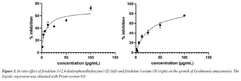 In the SVM modeling (Table 1), friedelin (1) and its oxime (3) and hydrazone (4) derivatives showed potential activity only for the L. braziliensis promastigote model, for which the hydrazone derivative 2 does not. The compound friedelan-3-(2,4-dinitrophenylhydrazone) (2) shows potential to be active for models of L. donovani promastigote, L. amazonensis amastigote, and L. donovani amastigote. β-Glycyrrhetic (5), ursolic (6), and oleanoic (7) acids showed potential activity against models of L. braziliensis promastigote, L. donovani promastigote, and L. donovani amastigote. However, only β-glycyrrhetic acid (5), like compound 2, showed potential activity against the L. amazonensis amastigote model. Finally, the betulonic acid (8) and its oxime derivative (9) showed potential activity against the L. braziliensis promastigote model, while oxime (9) was also potentially active in the L. donovani promastigote model. Naïve Bayes modeling (Table 2) shows little difference between compounds 1-9. All of them can potentially be active in models of L. braziliensis promastigote, L. donovani promastigote, and L. amazonensis amastigote. Only 2,4-dinitrophenylhydrazone (2) and hydrazone (4) derivatives showed potential activity for the L. donovani amastigote model. Therefore, based on our theoretical results on both SVM and Naïve Bayes modeling, we considered compound 2 (hydrazone derivative) the most potentially active, followed by β-glycyrrhizic acid (5). These compounds showed potential activity against seven Leishmania models. The oleanolic acid (7) and ursolic acid (6) showed potential activity against six models, considering both modeling methods. The following compounds are friedelin hydrazone derivative (4) and N-oxime derivative of betulonic acid (8) with five models, and friedelin (1), friedelin N-oxime (3), and betulonic acid (8) with four models. Considering all results, the order of potential activity for the evaluated pentacyclic triterpenes can be summarized as follows: ![]() Six other models were built beyond the above four (Tables 3S to 7S in Supplementary Material). No compound showed potential activity against the models associated with the amastigote form of L. infantum (LIA), L. major pteridine reductase (LMjPR), and L. mexicana pyruvate kinase (LMxPK). There is just one occurrence of promising activity for promastigote forms of L. major, L. mexicana, and L. infantum. It is important to note that the order of potential activity aligns with known activities and the measured anti-leishmania activity in this work. However, one exception to this trend is the higher potential activity of hydrazone derivative (4), which was not confirmed in the present work. This could be due to the high reactivity of this functional group, and its decomposition during the biological tests cannot be discarded. The data found in the literature about the activity of some of these compounds against the promastigote forms of Leishmania were compared with our calculations (see Table 8S, Supplementary Material). From experimental data, we can state that the most active compounds are betulonic acid (8) (IC50 8.5 μM, L. brasiliensis promastigote),13 and β-glycyrrhetic acid (5) (IC50 9.77 μM, L. donovani),27 followed by ursolic acid (6) and oleanolic acid (7) (against L. amazonensis promastigote).9 These results are close to our predictions except for betulonic acid (8). However, we must consider that our predictions are qualitative, and compound 8 was predicted as potentially active in several Leishmania models. Following the theoretical prediction, the proposed compounds 2-4 were synthesized by adding a nitrogen compound to the carbonyl group of 1. The compounds 2 and 3 were produced with good yields. However, compound 4 was obtained with a lower yield, which can be explained by the fact that the hydrazone obtained is reactive and prone to degradation. Details about the obtention and identification of friedelin N-derivatives (2-4) are presented in the Supplementary Material (Figures 1S-20S). In vitro inhibition of L. amazonensis According to Corman et al.,4 much research has been focused on L. amazonensis, as this species is predominant in the New World and has the potential for chronic disease. For the first time, N-derivatives of friedelin (2-4) were evaluated in vitro against extracellular promastigote forms of L. amazonensis. The compounds 2 and 3 inhibited the growth of L. amazonensis, showing a % inhibition of 69.0 and 77.3 at 100 µg mL-1, respectively. They showed IC50 8.9 µg mL-1 (14.7 μM) and 30.0 µg mL-1 (65.8 μM), respectively (Figure 3). However, compound 4 showed no activity in the assay's conditions.