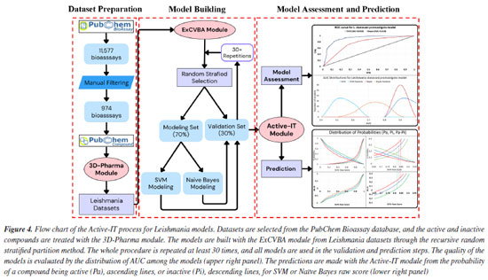 Model building and prediction The NEQUIM Active-IT system was used to build and validate predictive models for Leishmania species and to predict the anti-Leishmania activity of pentacyclic triterpenes. The full details of the methodology are available elsewhere;14-17 thus, only a summary will be provided here. The molecular 3D structures of substances were converted into 3D pharmacophore fingerprints using the 3D-Pharma module.25 It categorizes atoms based on their interaction potential and calculates all sets of pharmacophore triplets and their distances to create a comprehensive vector of potential pharmacophores. The fingerprints of all conformations are combined to form a unique modal vector34 for each compound, incorporating dynamic conformational changes (4D pharmacophore fingerprints). The model corresponding to each dataset was constructed using the ExCVBA module26 and two supervised learning techniques: support vector machine using LibSVM35 and Naive Bayes.36 According to the Active-IT protocol, the models were developed using a recursive random stratified partition method to ensure reliability and robustness (Figure 4, Model Building). Active and inactive compounds are divided into subsets for model building (70%) and validation (30%), and the process is repeated at least 30 times. No model is discharged, and all of them will be used in the prediction phase. The average scores of each compound over the models where it appears in the validation set were used to assess the modeling performance with the area under the ROC curve (AUC), as well as for activity prediction of new compounds. The activity prediction of a new compound starts by building its modal fingerprint and submitting it to various models for each biological activity to calculate its raw score. The average scores were converted into probabilities through comparison with active and inactive compound score distributions, producing a measure of belonging to these two subsets.14,15,37 The Pa value is derived from the fraction of active compounds with a raw score smaller than the new compound. In contrast, the Pi value is calculated from the fraction of inactive compounds with better raw score (Figure 4, lower right panel). The difference between these probabilities, the Pa-Pi value, is fundamental in determining the activity potential of the compound. Previous studies17 have shown specific cutoff values for SVM (Pa-Pi ≥ 0.5) and Naive Bayes (Pa-Pi ≥ 0.8) models that indicate the most promising activities and targets for the compound. In vitro inhibition of promastigote forms of Leishmania amazonensis Sterile Schneider culture medium (Sigma-Aldrich®) (100 µL) was added to a 96-well tissue culture plate. Then, compounds 2 and 3 were added in serial dilutions. A suspension of 105 promastigote forms of L. amazonensis, previously isolated from infected tissue and counted in a Neubauer chamber, was added to each well. The final volume of each well was adjusted to 200 µL. The final concentration of the samples in the first dilution was 100.0 µg mL-1. The plate was incubated for 48 h at 22-26 ºC. After this period, in each well was added 100.0 μg of 3-(4,5-dimethylthiazol-2-yl)-2,5-diphenyltetrazolium bromide (MTT) solution in PBS (phosphate-buffered saline (Sigma-Aldrich®)) at 5.0 mg mL-1, for 4 h at 37 ºC and protected from light. Then, 100.0 µL of DMSO (dimethyl sulfoxide, Merck) was added to dissolve the formazan crystals. In this experiment, L. amazonensis promastigotes were used in the log phase to improve the absorbance reading, measured in a Shimadzu UV/VIS spectrophotometer Model: UV 1800, at 570 nm, to quantify the metabolization rate of the colorimetric agent. L. amazonensis treated with amphotericin B (Sigma-Aldrich®) was used as a positive control, and L. amazonensis without any treatment was used as a negative control. The experiments were carried out in duplicate. After a five-day incubation period, the results were expressed as the concentrations inhibiting parasite growth by 50% (IC50), calculated using logistic regression with the GraphPad Prism version 9.0.0 (GraphPad Software, La Jolla, CA, USA).